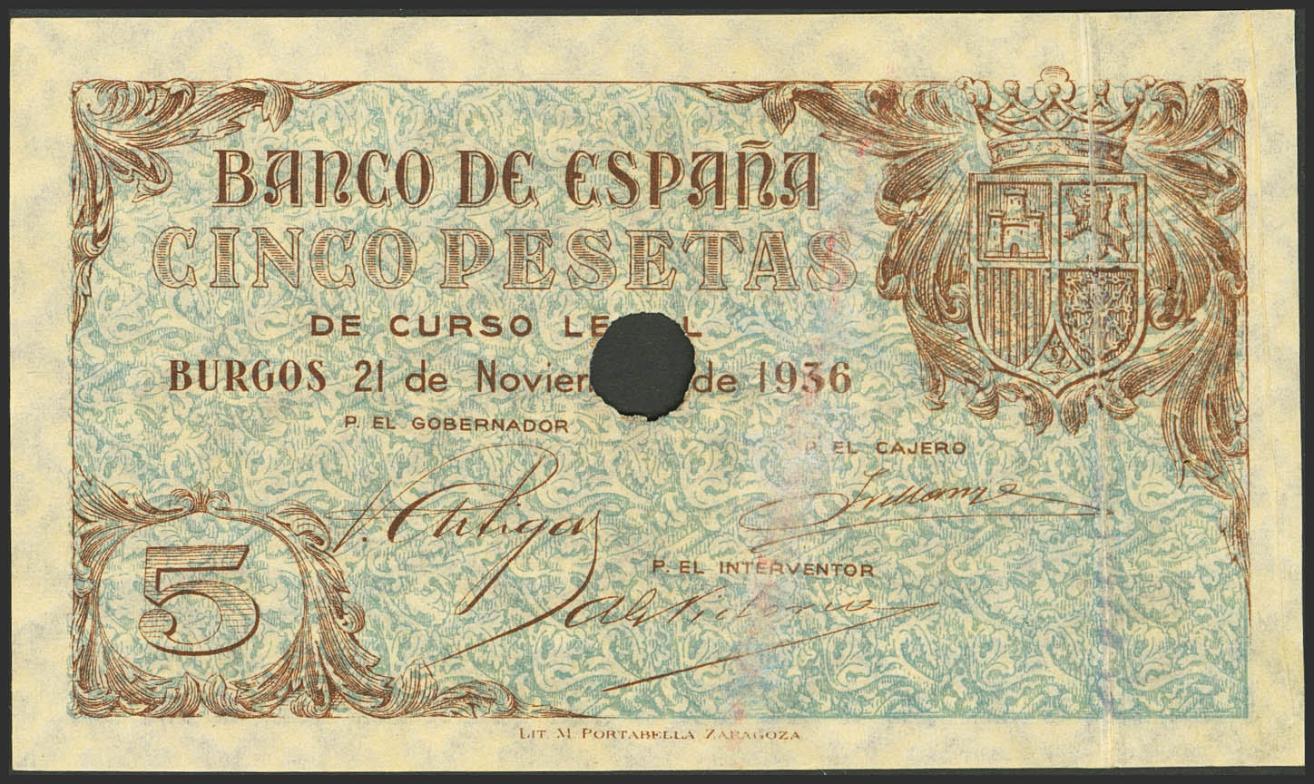 5 Pesetas. 21 de Noviembre de 1936. Taladrado y sin numeración. (Edifil 2021: 417T). Inusual y apresto original, puntitos de grapa como todos los conocidos. EBC.