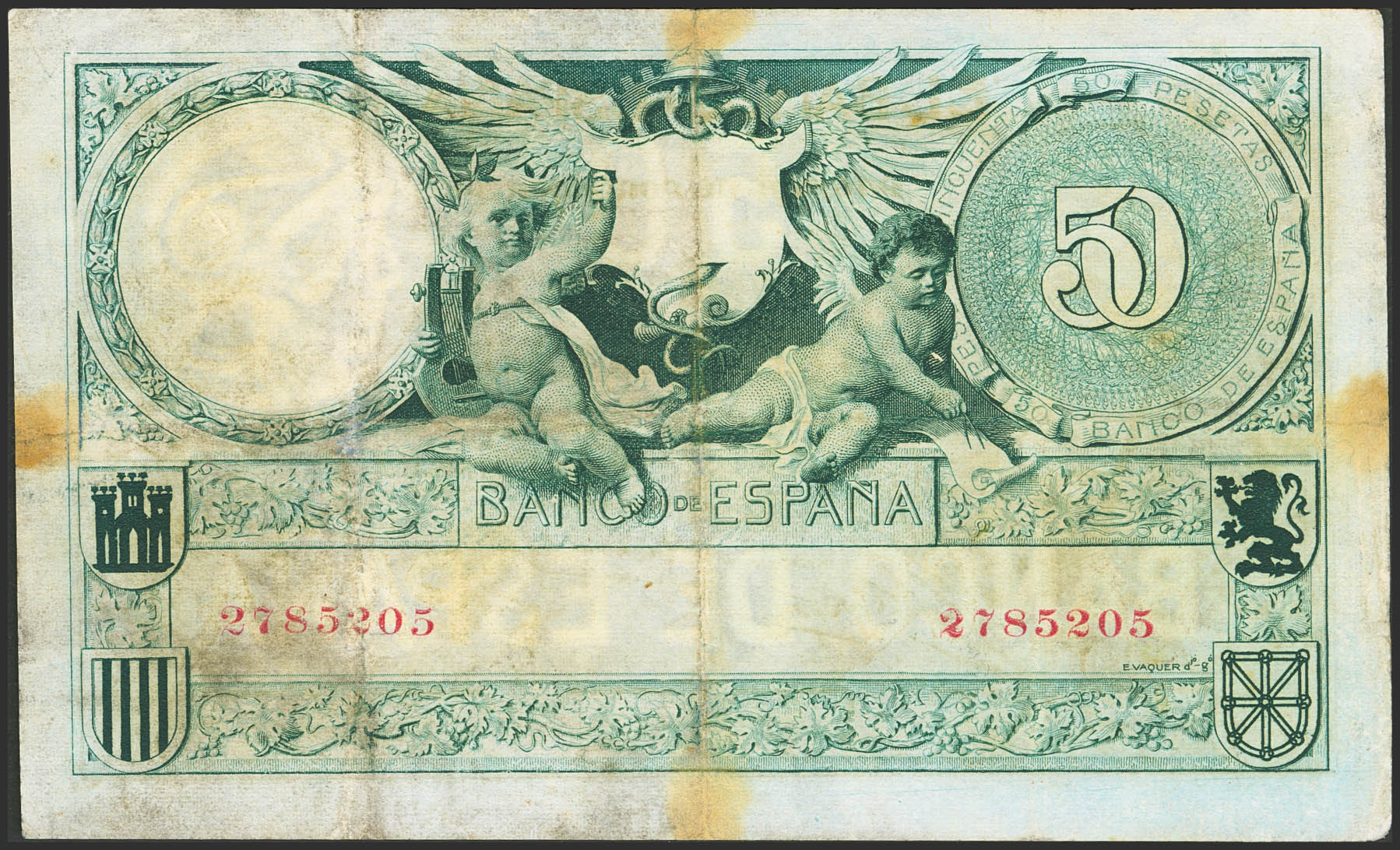50 Pesetas. 19 de Marzo de 1905. Sin serie. (Edifil 2023: 312). Raro, mínimamente reparado. MBC.