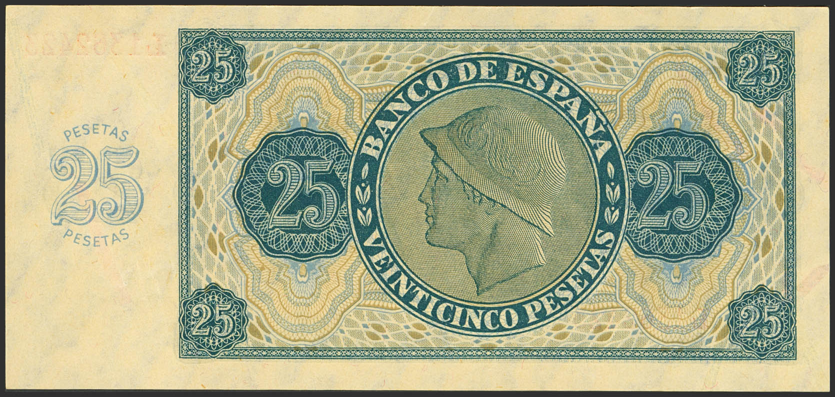 25 Pesetas. 21 de Noviembre de 1936. Serie L. (Edifil 2023: 419a). Apresto original. SC-.