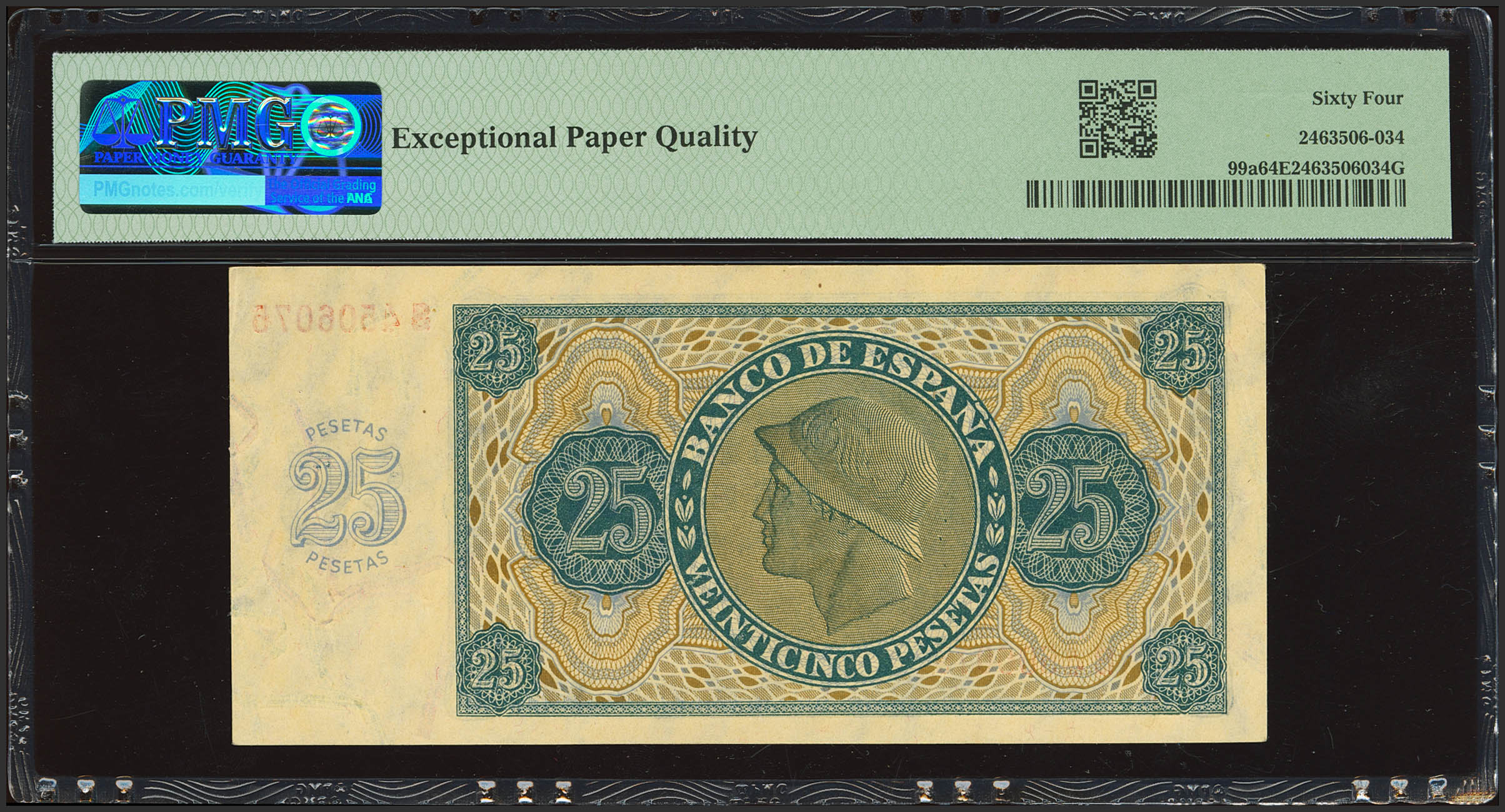 25 Pesetas. 21 de Noviembre de 1936. Serie S, última serie emitida. (Edifil 2023: 419b, Pick: 99a). Inusual. SC. Encapsulado PMG64EPQ.