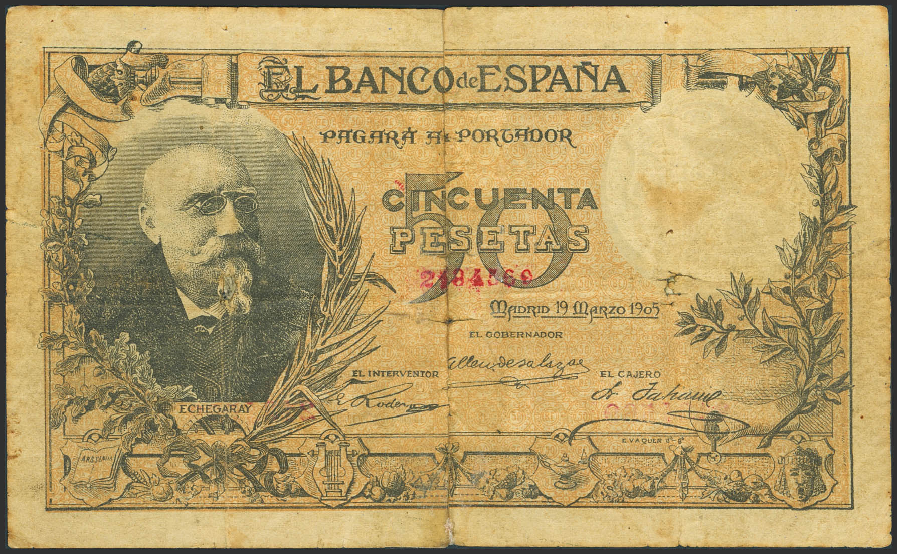 50 Pesetas. 19 de Marzo de 1905. Falso de Epoca. Sin serie. (Edifil 2023: 312F, Cobo: 31). Muy raro, reparado. BC+.