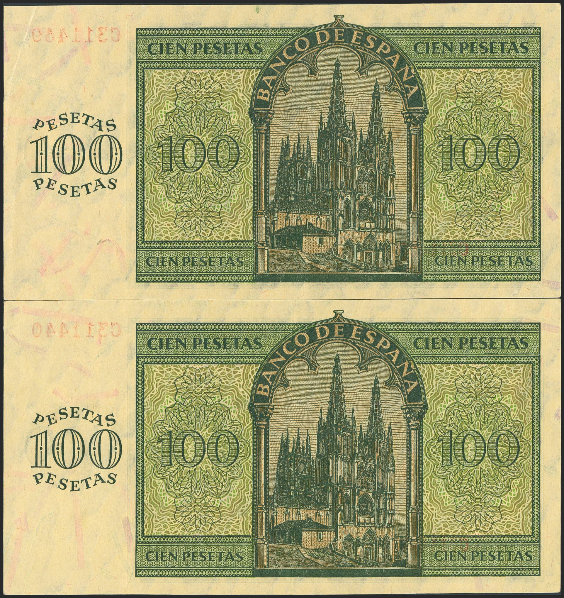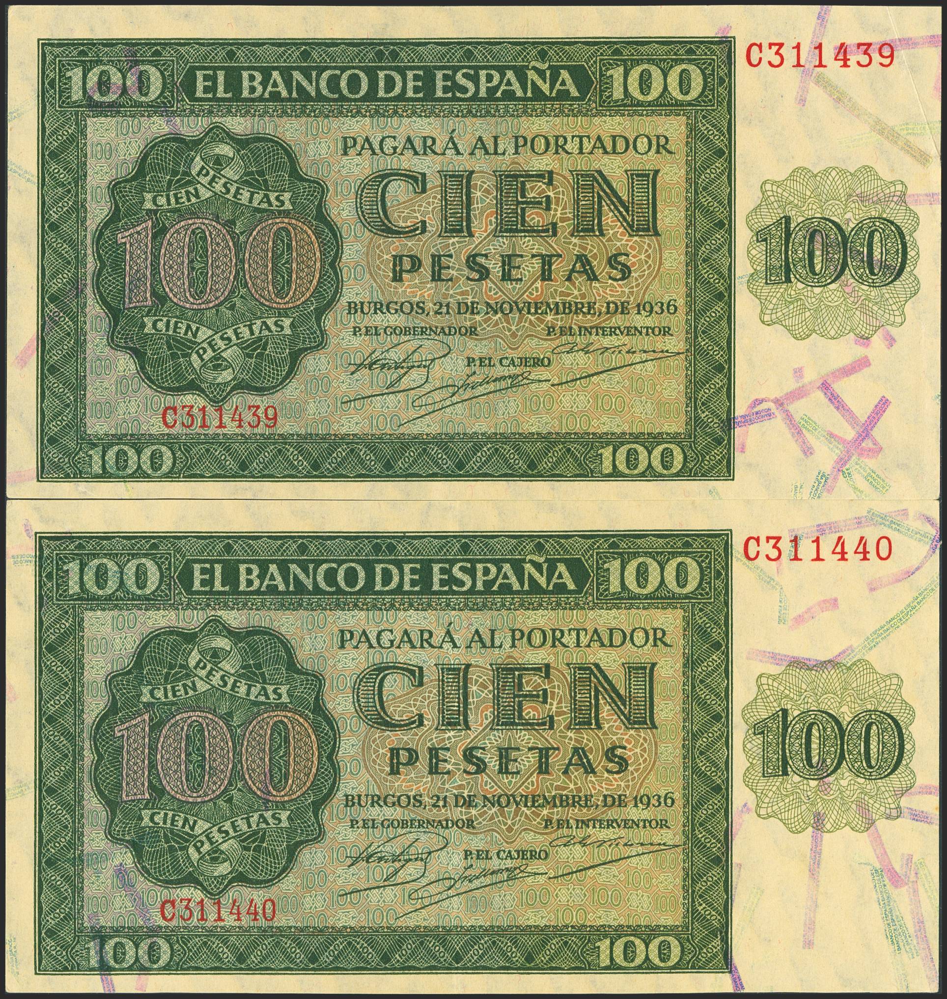 100 Pesetas. 21 de Noviembre de 1936. Pareja correlativa. Serie C. (Edifil 2023: 421a). Conserva gran parte de su apresto original. EBC+.