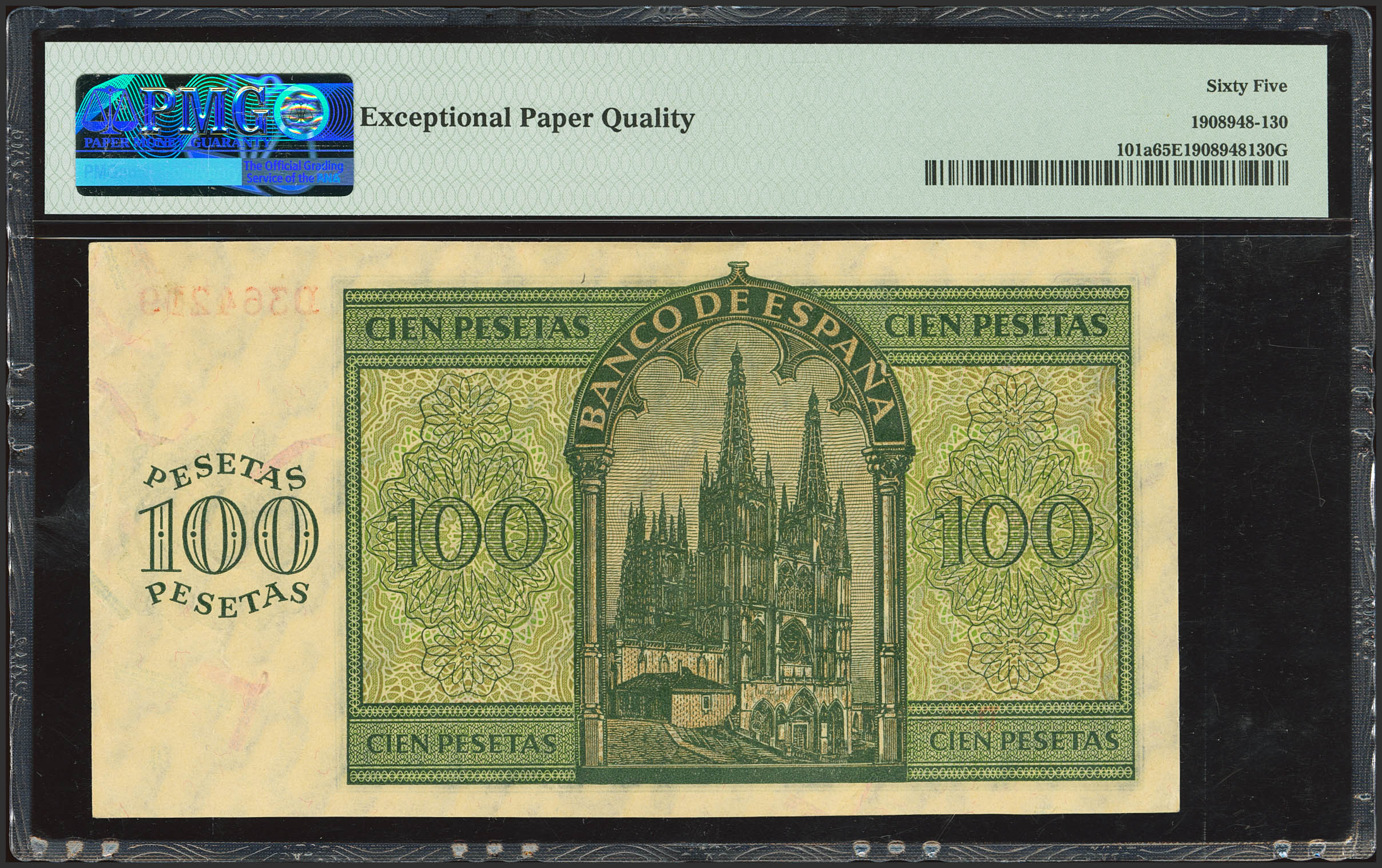 100 Pesetas. 21 de Noviembre de 1936. Serie D. (Edifil 2023: 421a, Pick: 101a). Raro en esta calidad, apresto original. SC. Encapsulado PMG65EPQ.