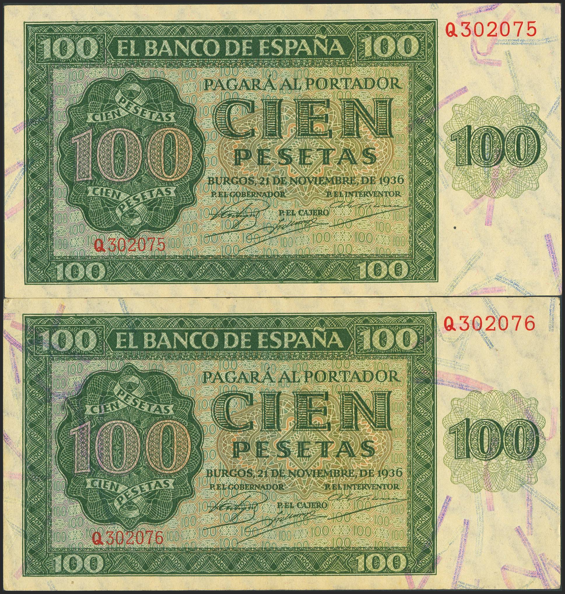 100 Pesetas. 21 de Noviembre de 1936. Pareja correlativa. Serie Q. (Edifil 2023: 421a). Conserva gran parte de su apresto original. EBC+.
