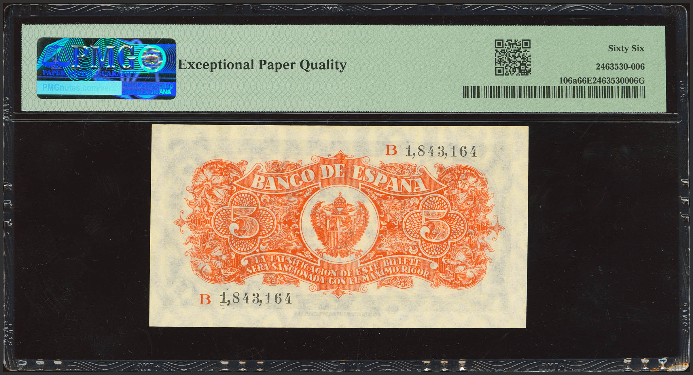 5 Pesetas. 18 de Julio de 1937. Serie B. (Edifil 2023: 424a, Pick: 106a). Muy raro en esta calidad, apresto original. SC. Encapsulado PMG66EPQ.