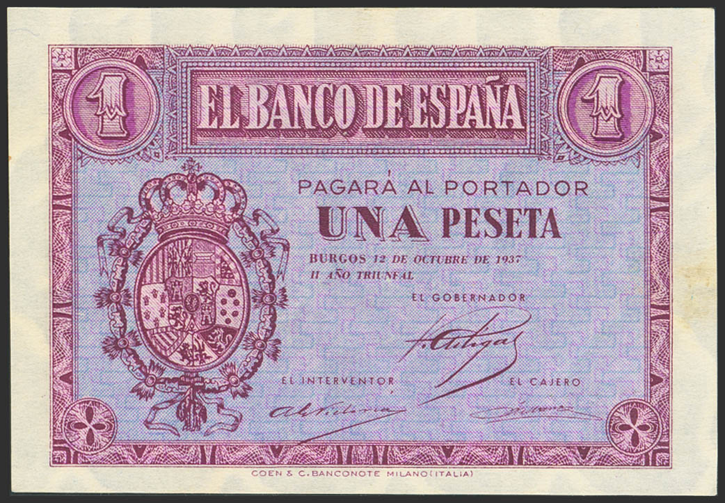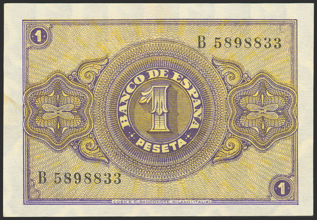 1 Peseta. 12 de Octubre de 1937. Serie B. (Edifil 2023: 425a). Apresto original, mínima manchita del tiempo sin importancia. SC-.
