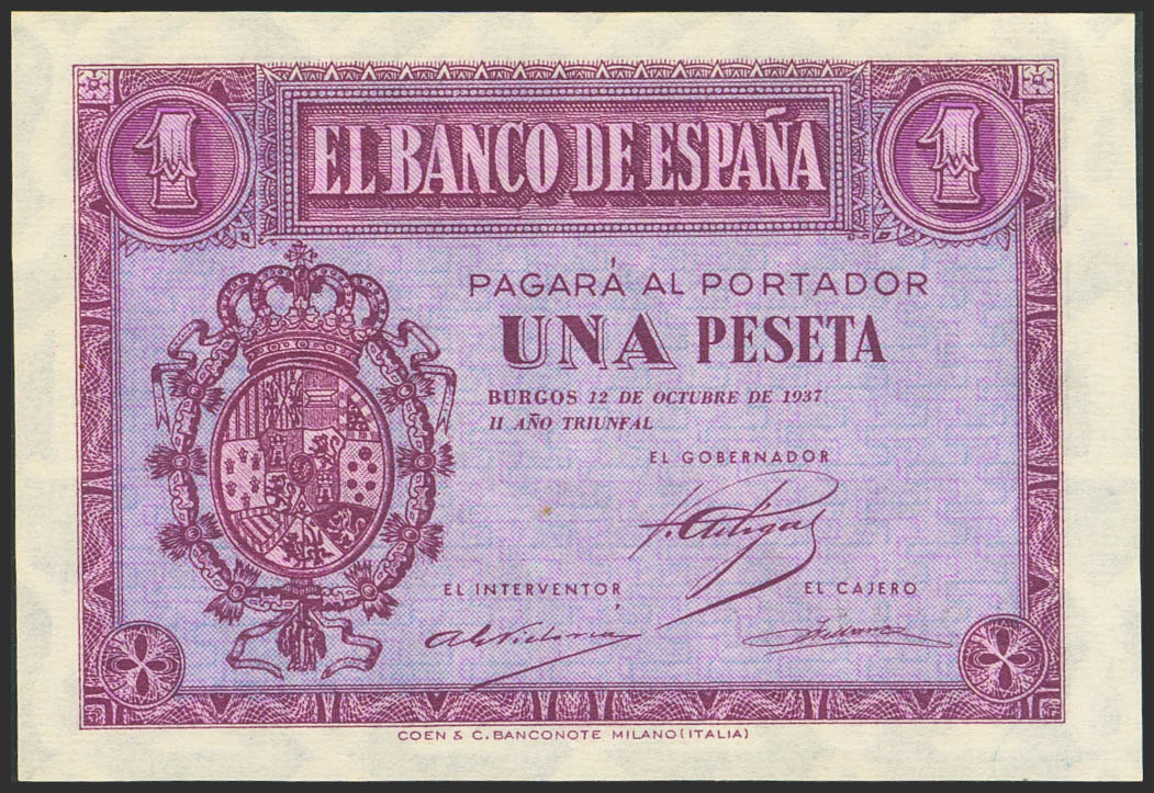 1 Peseta. 12 de Octubre de 1937. Serie E. (Edifil 2023: 425a). Apresto original. SC.