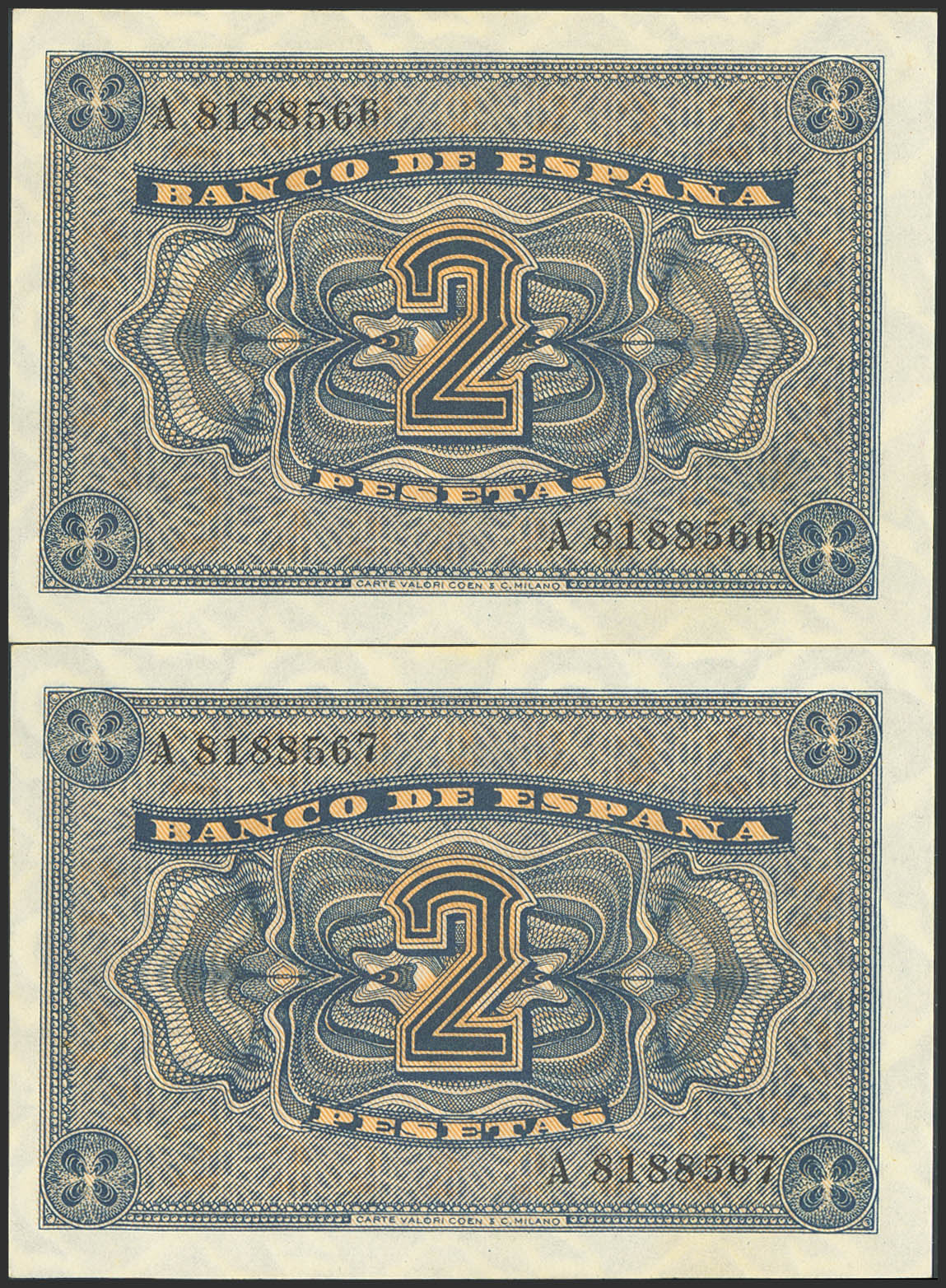2 Pesetas. 12 de Octubre de 1937. Pareja correlativa. Serie A. (Edifil 2023: 426). Rarísima pareja, especialmente en esta calidad, apresto original. SC.