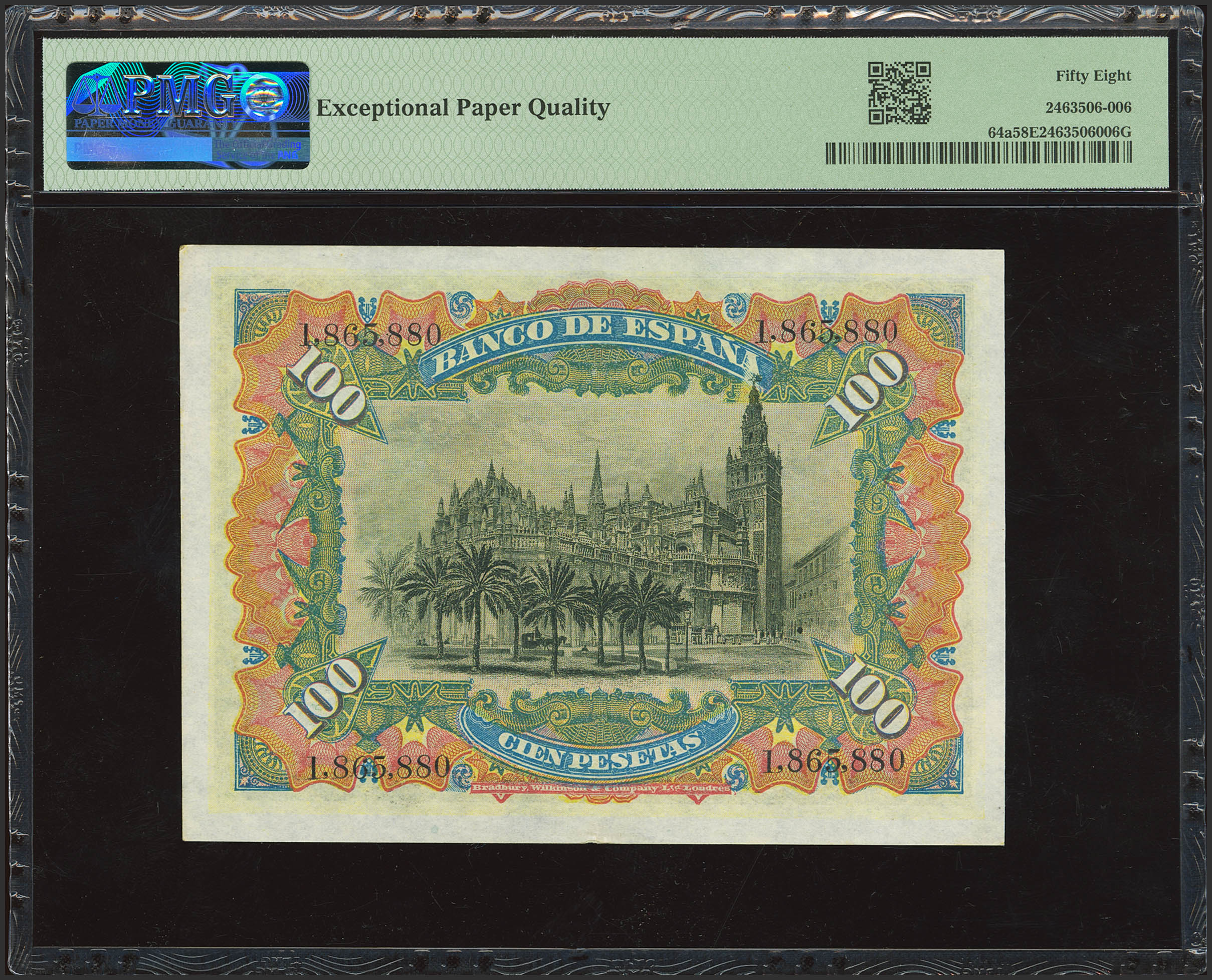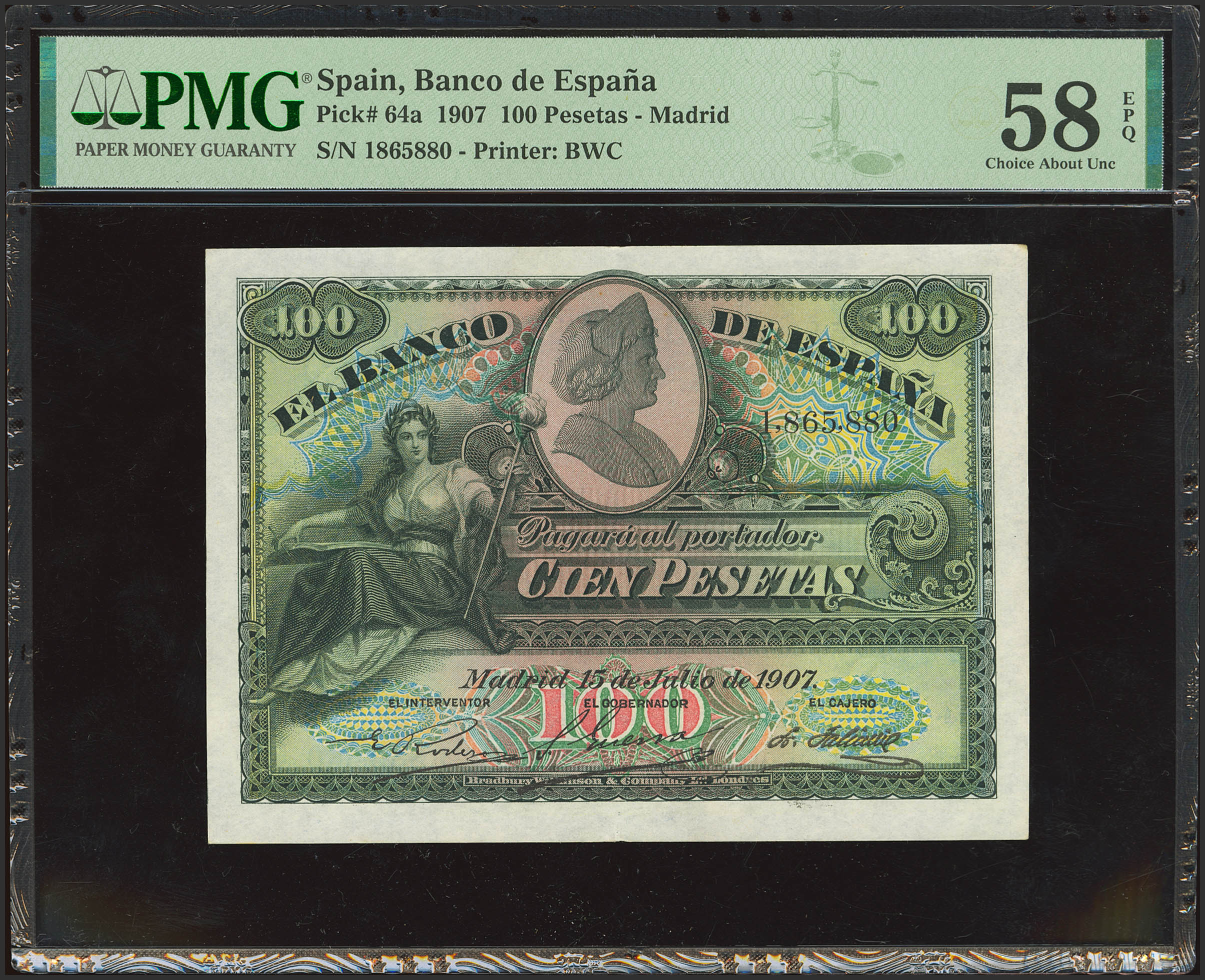 100 Pesetas. 15 de Julio de 1907. Sin serie. (Edifil 2023: 320, Pick: 64a). Inusual en esta calidad, apresto original. EBC+++. Encapsulado PMG58EPQ.