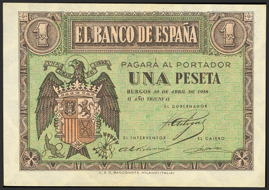 1 Peseta. 30 de Abril de 1938. Serie C. (Edifil 2023: 428a). Apresto original. SC.