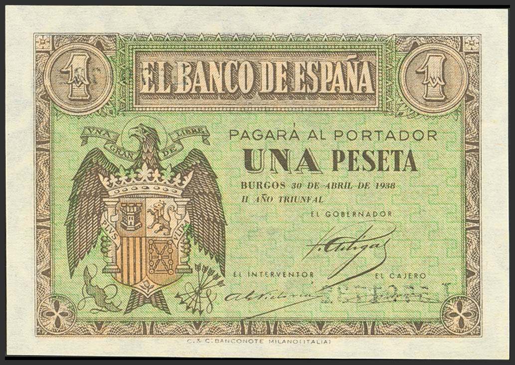1 Peseta. 30 de Abril de 1938. Serie L. (Edifil 2023: 428a). Apresto original. SC.