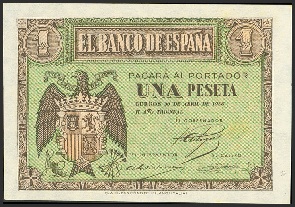 1 Peseta. 30 de Abril de 1938. Serie M. (Edifil 2023: 428a). Apresto original. SC.