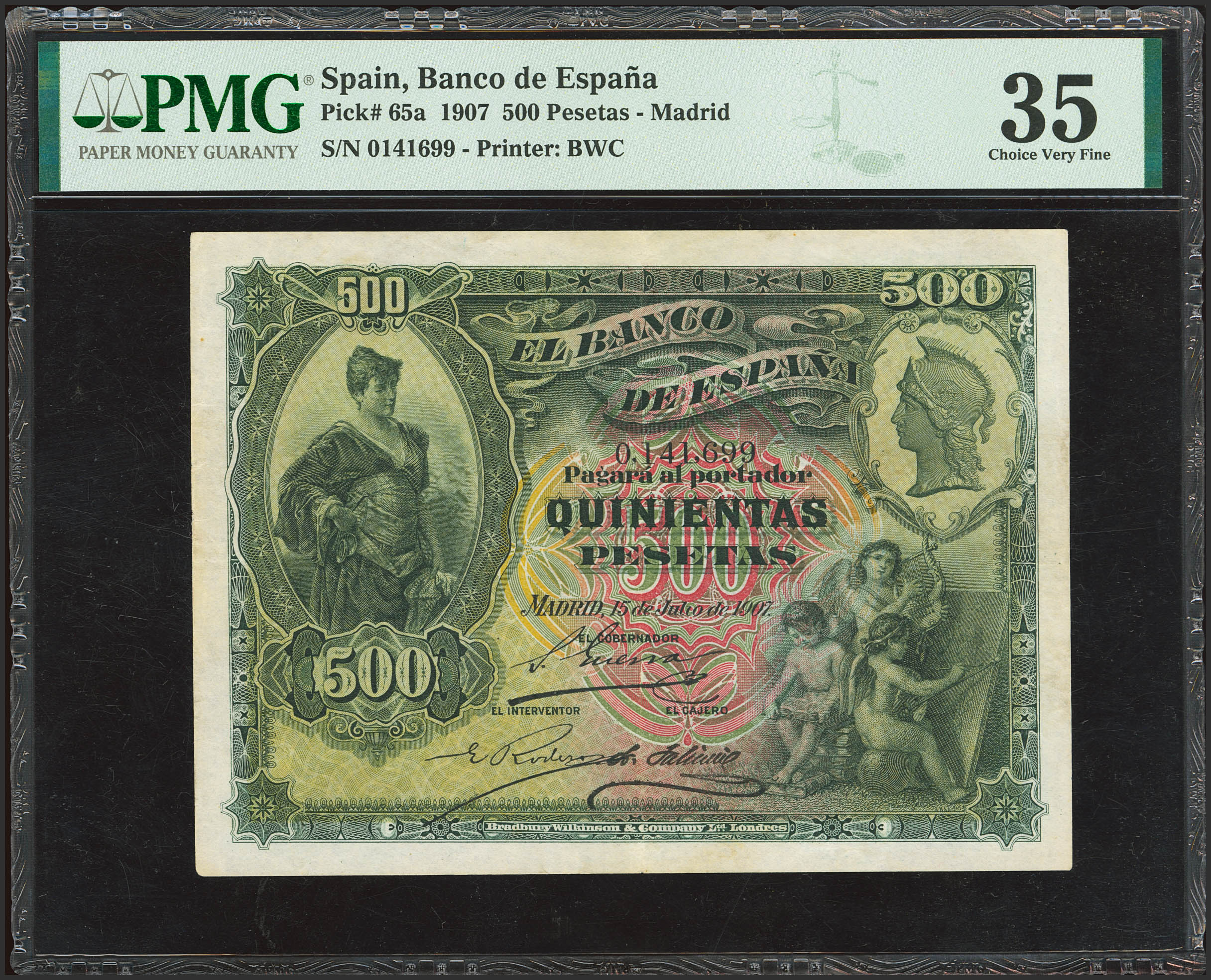 500 Pesetas. 15 de Julio de 1907. Sin serie. (Edifil 2023: 321, Pick: 65a). Raro sin ninguna reparación. MBC+. Encapsulado PMG35.
