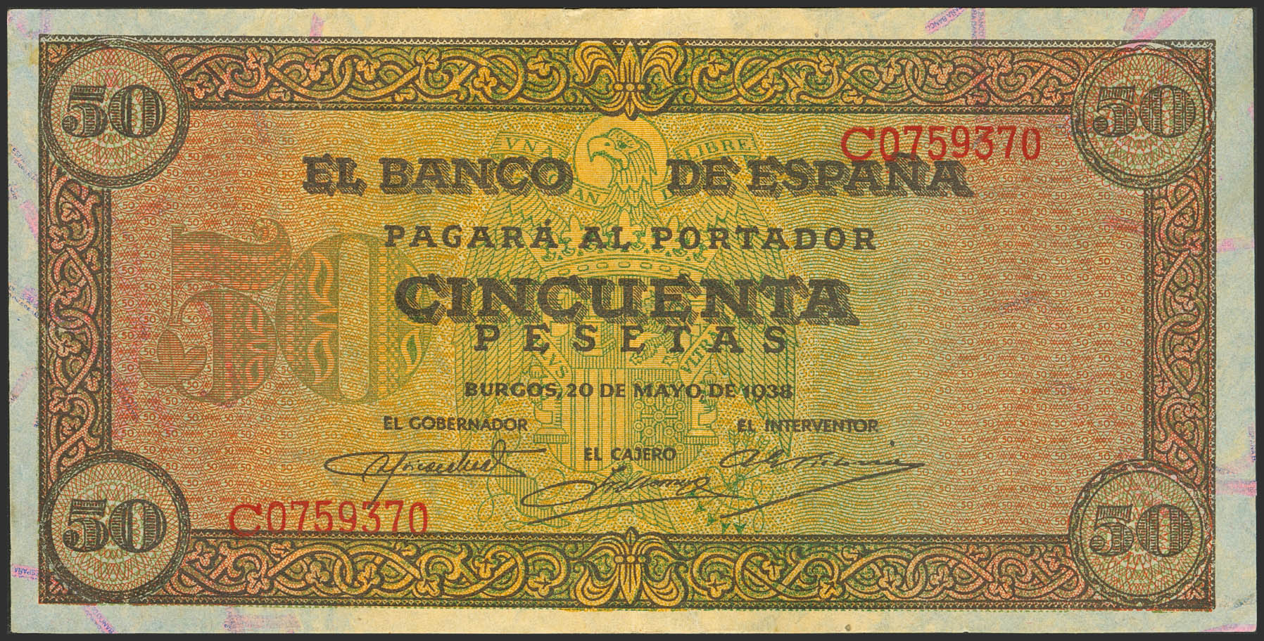 50 Pesetas. 20 de Mayo de 1938. Serie C. (Edifil 2023: 431a). Conserva gran parte de su apresto original. EBC.
