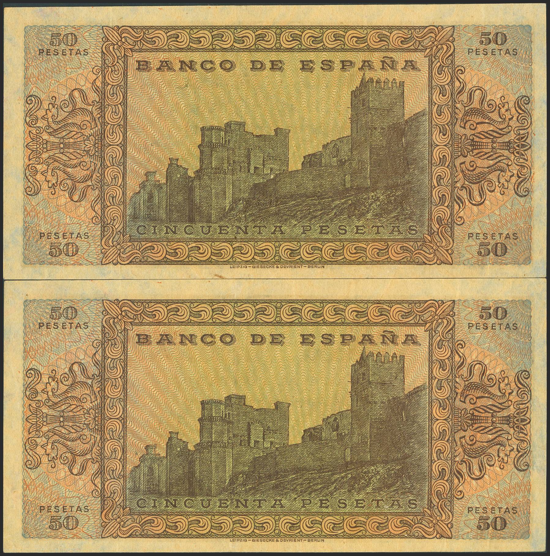 50 Pesetas. 20 de Mayo de 1938. Pareja correlativa. Serie B. (Edifil 2023: 431a). MBC+.
