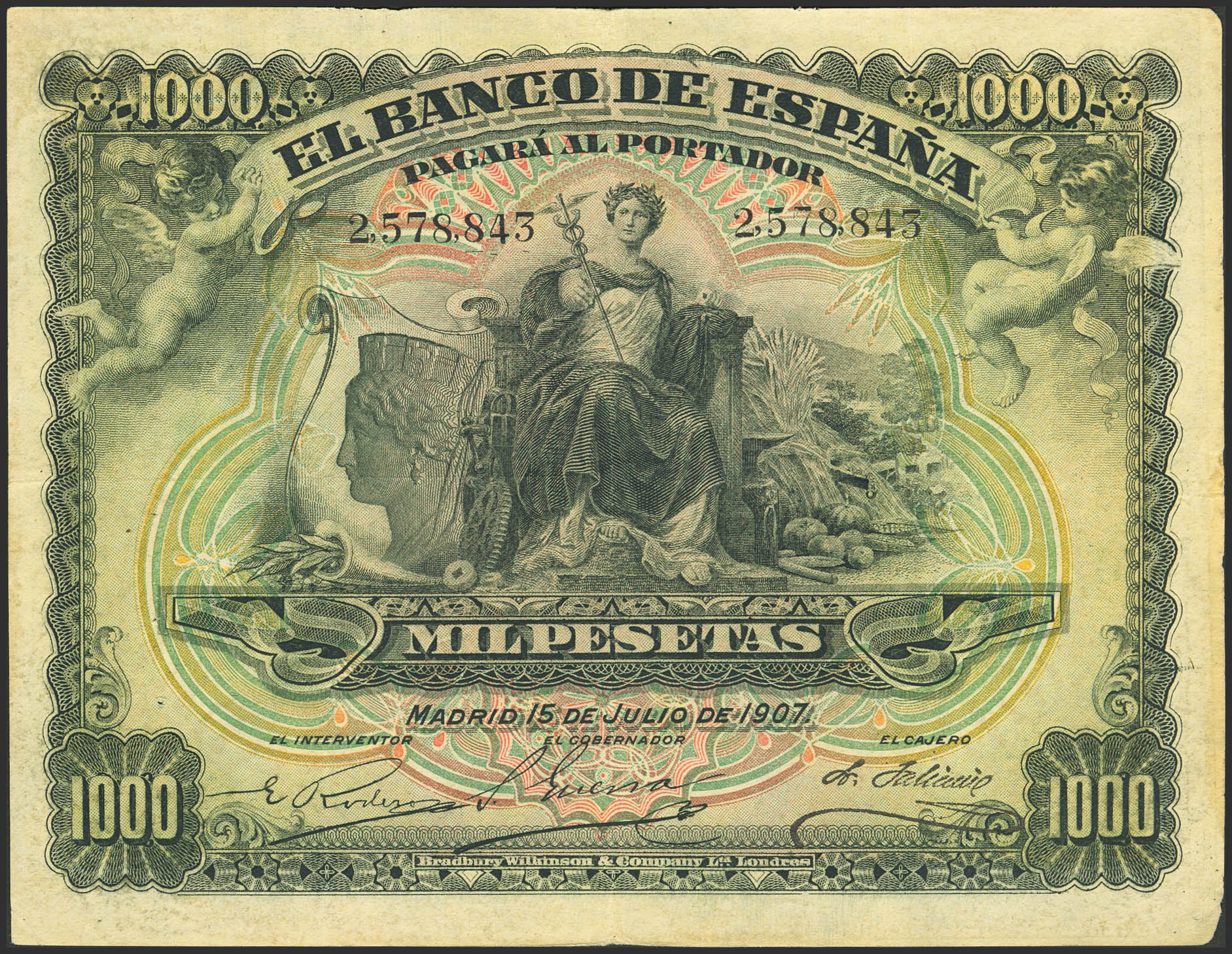 1000 Pesetas. 15 de Julio de 1907. Sin serie. (Edifil 2023: 322). Inusual especialmente sin reparaciones. MBC-.