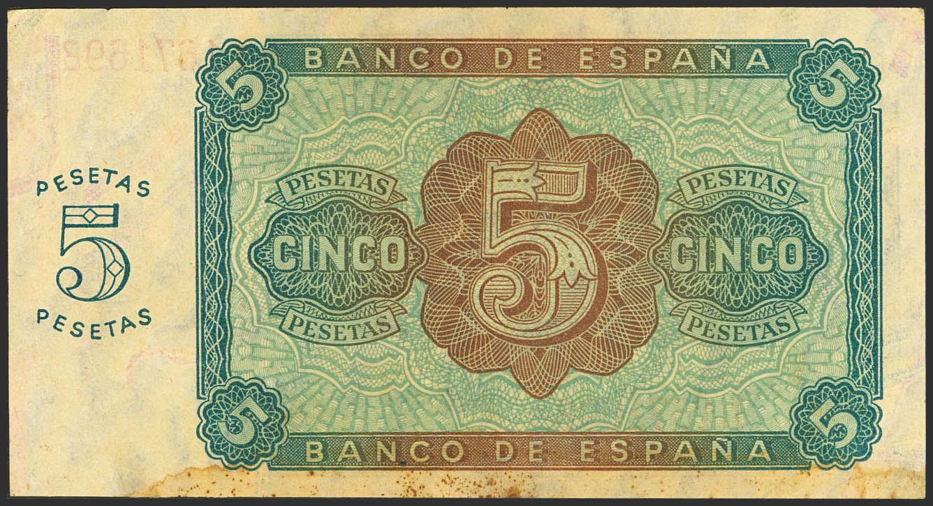 5 Pesetas. 10 de Agosto de 1938. Serie L. (Edifil 2023: 435a). Manchas del tiempo. EBC-.