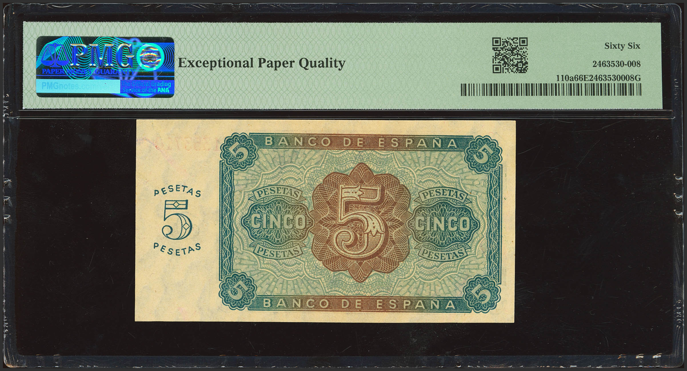 5 Pesetas. 10 de Agosto de 1938. Serie M, última serie emitida. (Edifil 2023: 435b, Pick: 110a). Rarísima serie, especialmente en esta rara calidad, apresto original. SC. Encapsulado PMG66EPQ.