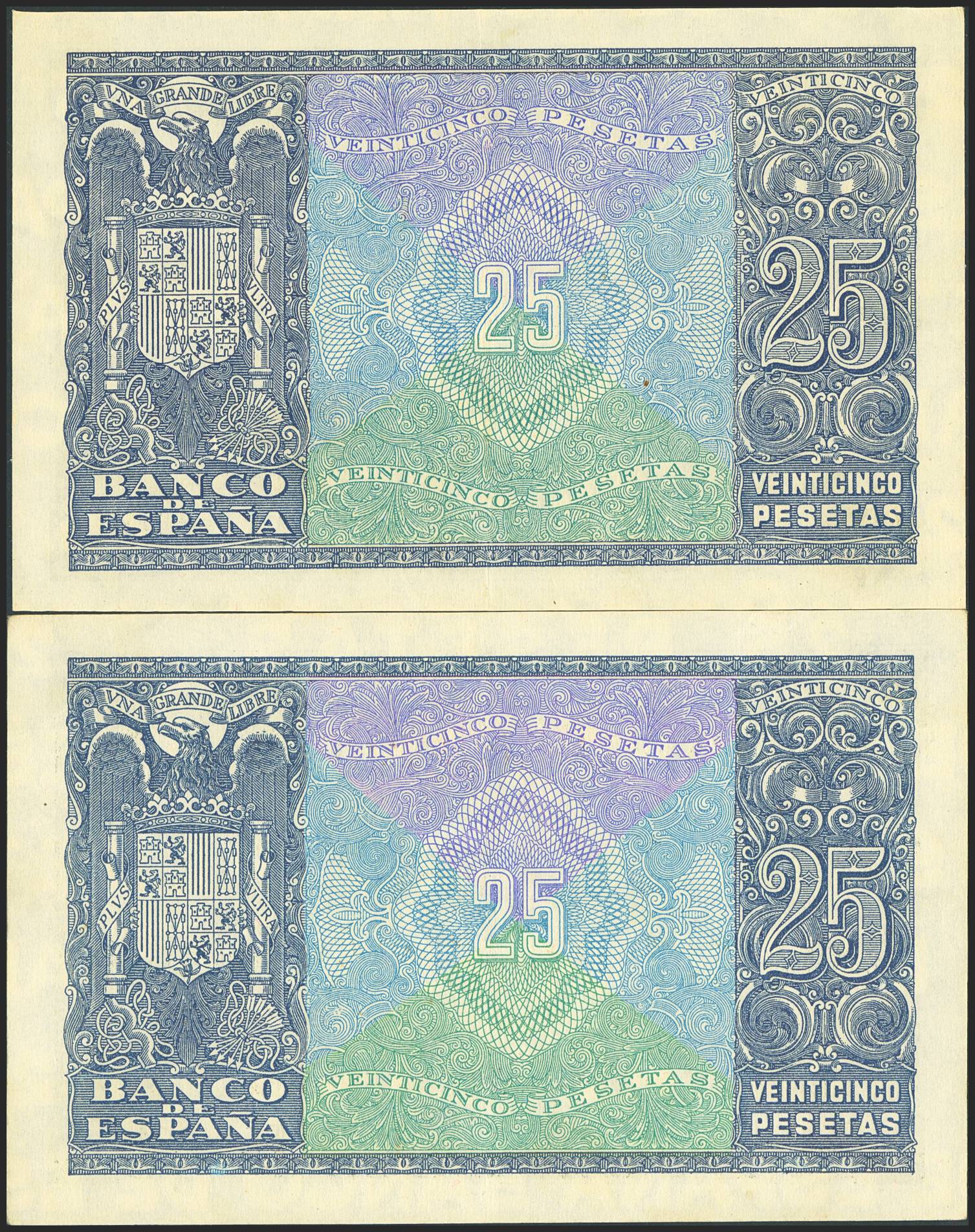 25 Pesetas. 9 de Enero de 1940. Pareja correlativa. Serie F, última serie emitida. (Edifil 2023: 436b). Conserva gran parte de su apresto original. EBC.