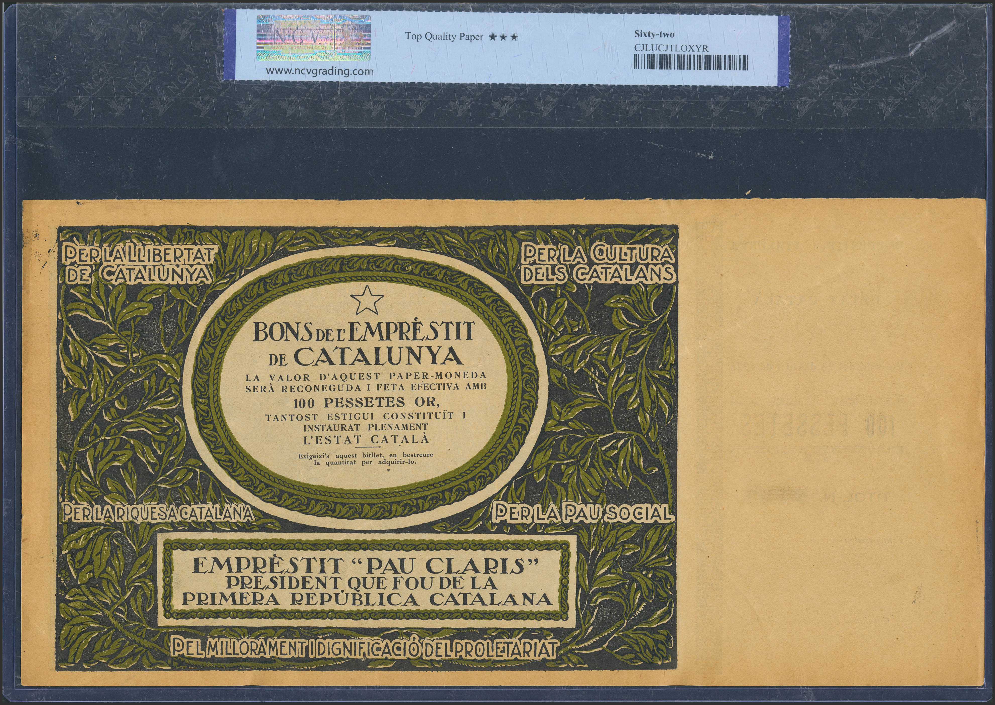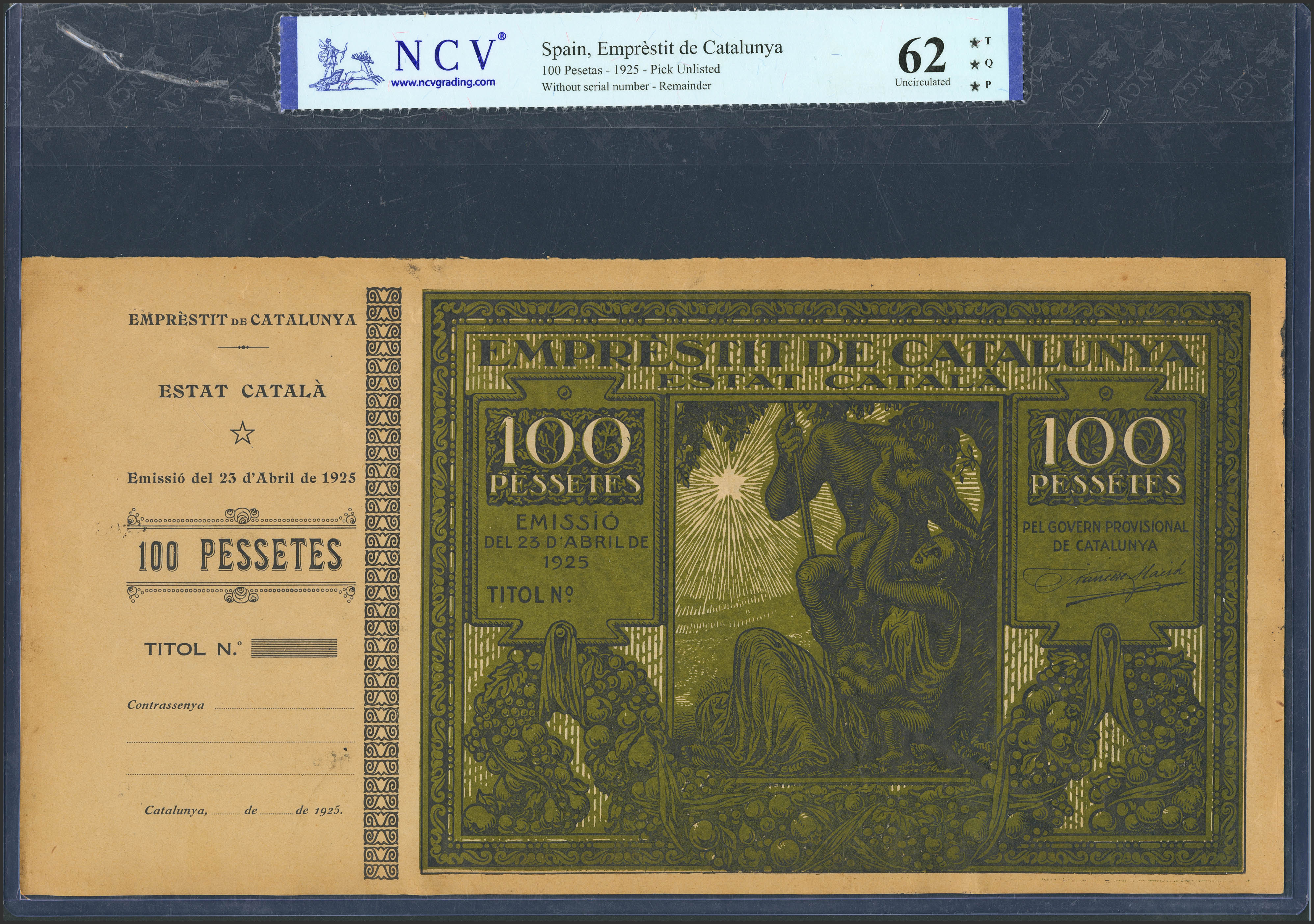 EMPRESTIT DE CATALUNYA. ESTAT CATALA. 23 de Abril de 1925. Emprestits Pau Clarís. Prueba (remainder) de anverso y reverso del billete de 100 Pessetes. Apresto original. SC. Encapsulado NCV62TQP.