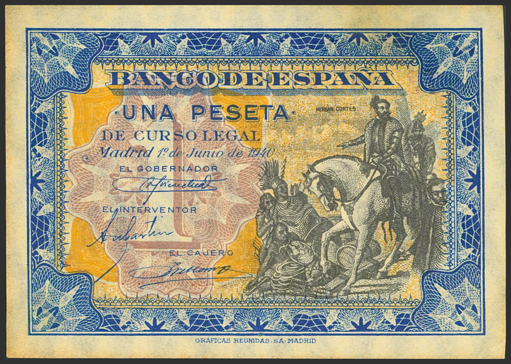 1 Peseta. 1 de Junio de 1940. Serie A. (Edifil 2023: 441a). Ligeras sombras del tiempo, conserva gran parte de su apresto original. SC--.