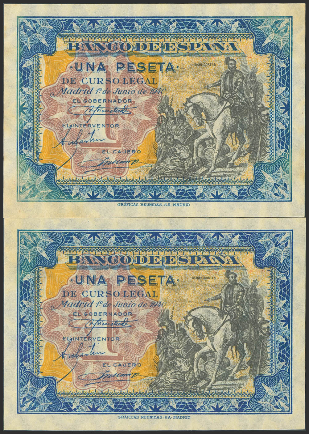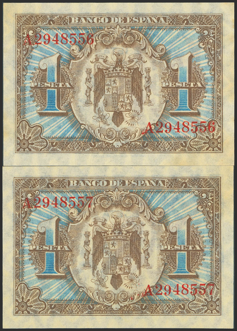 1 Peseta. 1 de Junio de 1940. Pareja correlativa. Serie A. (Edifil 2023: 441a). Apresto original. SC-.