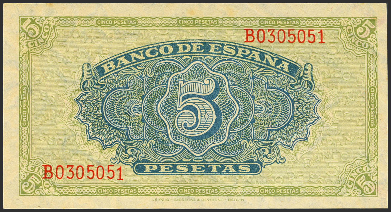 5 Pesetas. 4 de Septiembre de 1940. Serie B. (Edifil 2023: 443a). Apresto original. SC-.