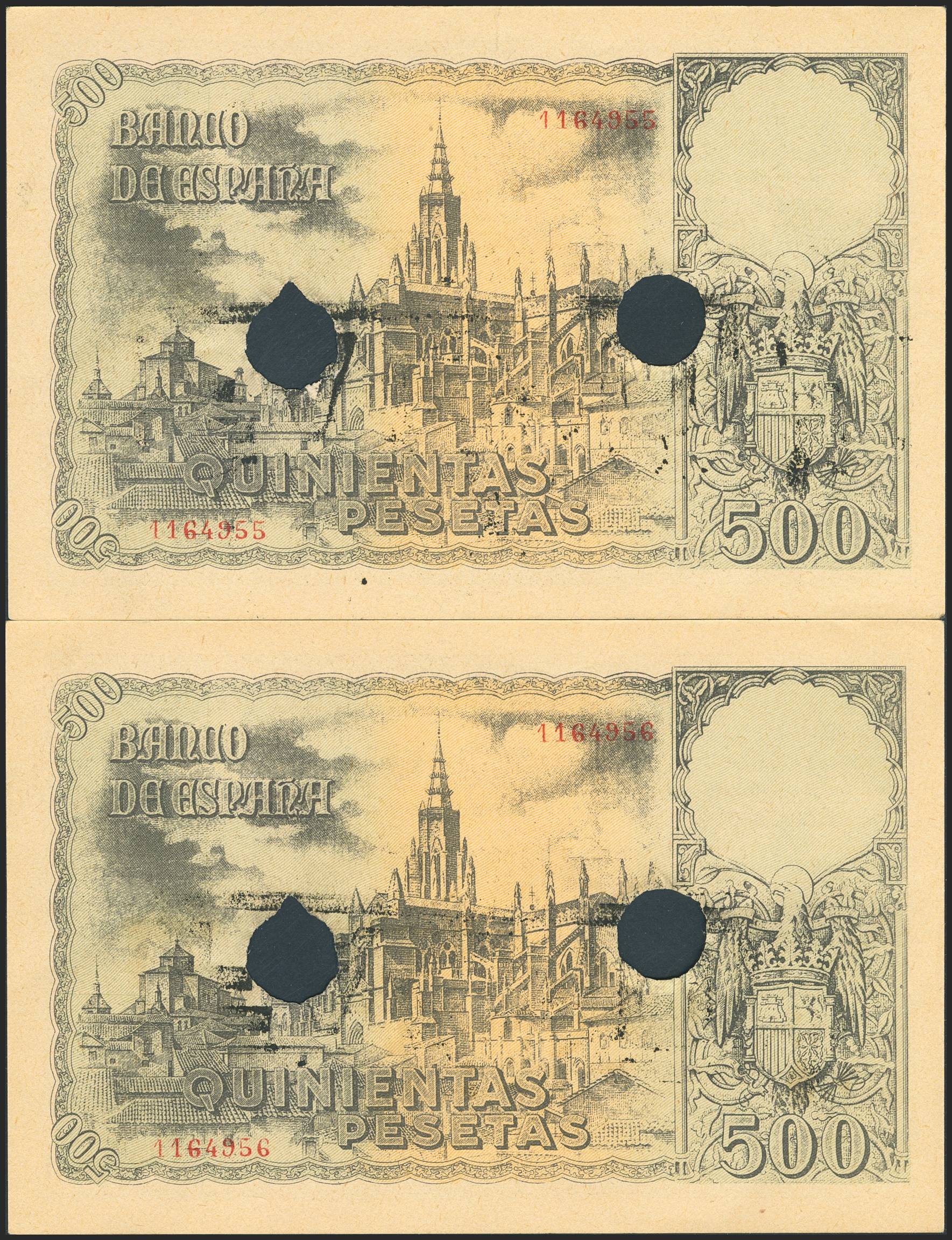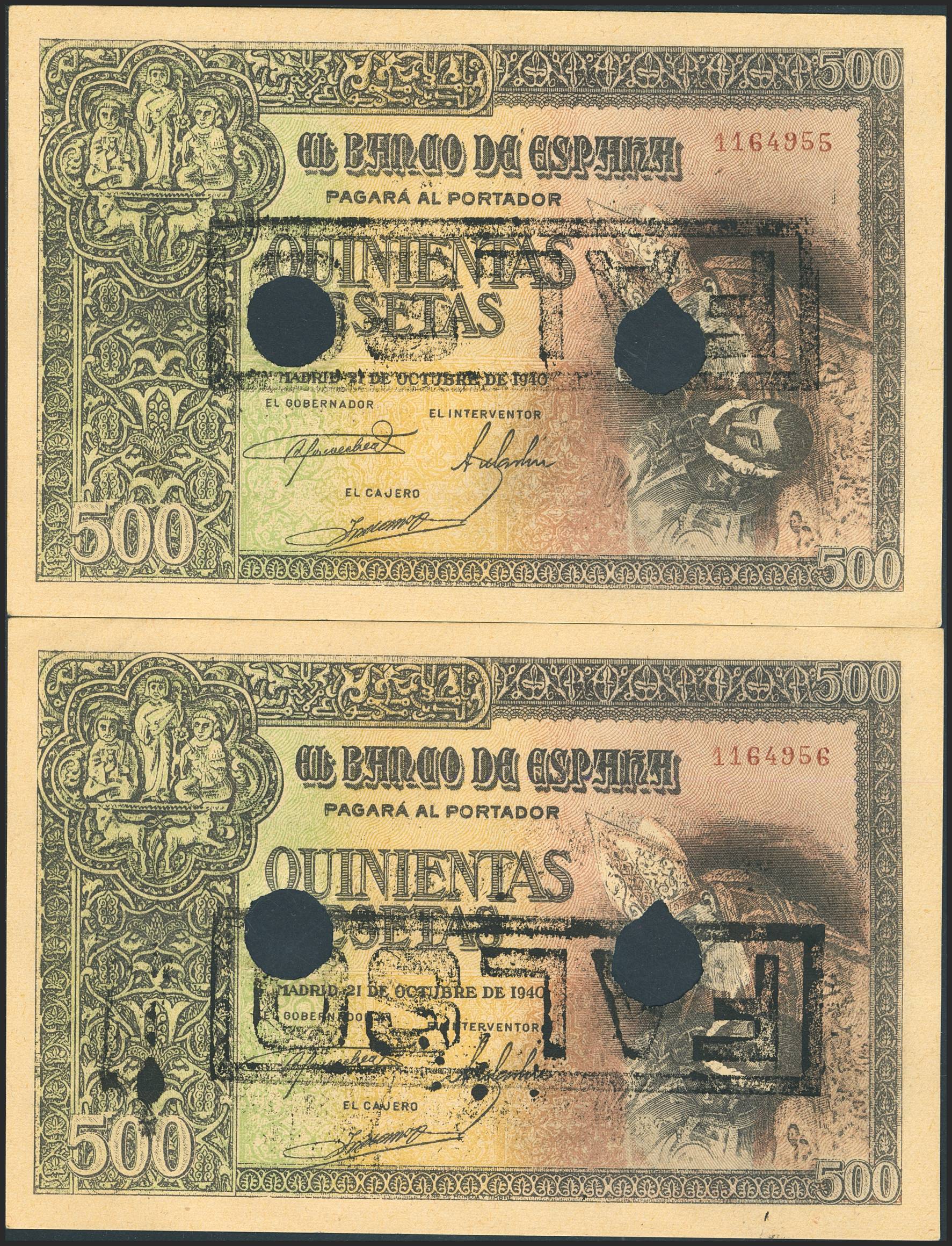 500 Pesetas. 21 de Octubre de 1940. Pareja correlativa. Falso de época, con taladros y marca FALSO. Sin serie. (Edifil 2023: 444F, Cobo: 43). Conserva gran parte de su apresto original. SC--.