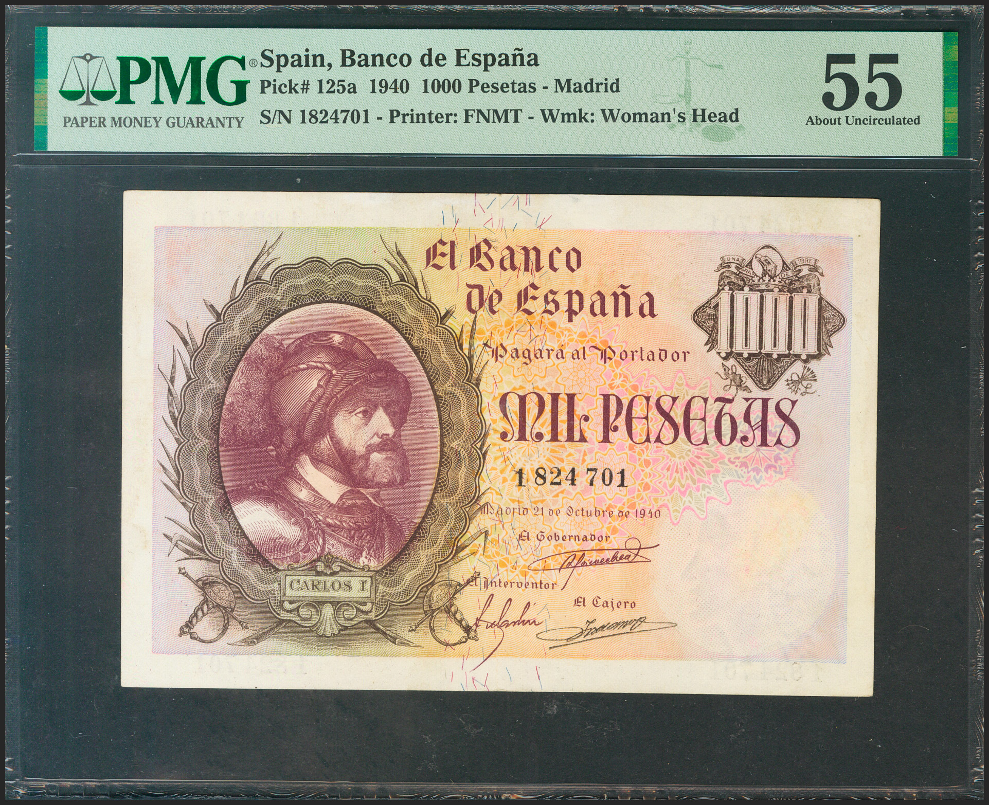 1000 Pesetas. 21 de Octubre de 1940. Sin serie. (Edifil 2021: 445, Pick: 125a). Muy raro en esta calidad, manchitas aclaradas. EBC+. Encapsulado PMG55.