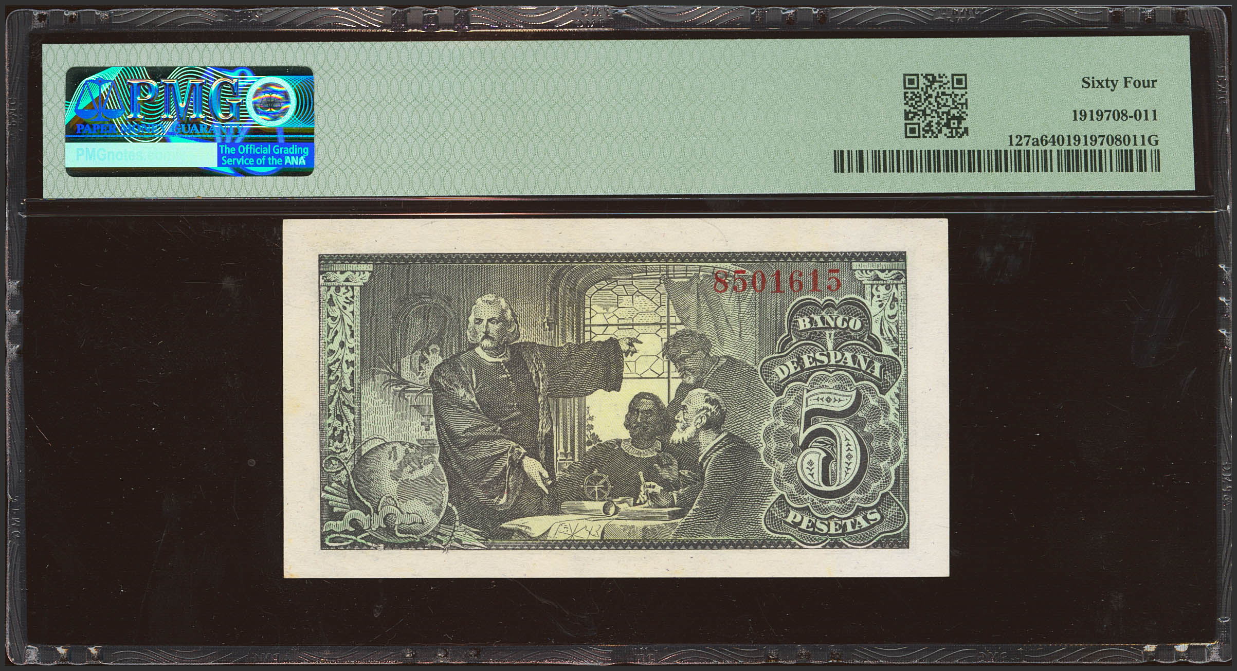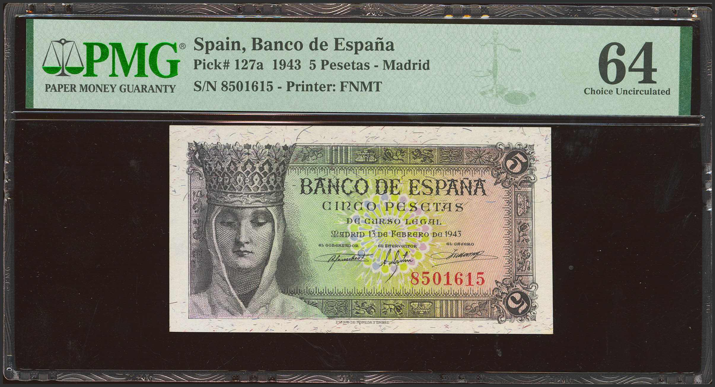 5 Pesetas. 13 de Febrero de 1943. Sin serie. (Edifil 2023: 446, Pick: 127a). Inusual en esta calidad. SC. Encapsulado PMG64.
