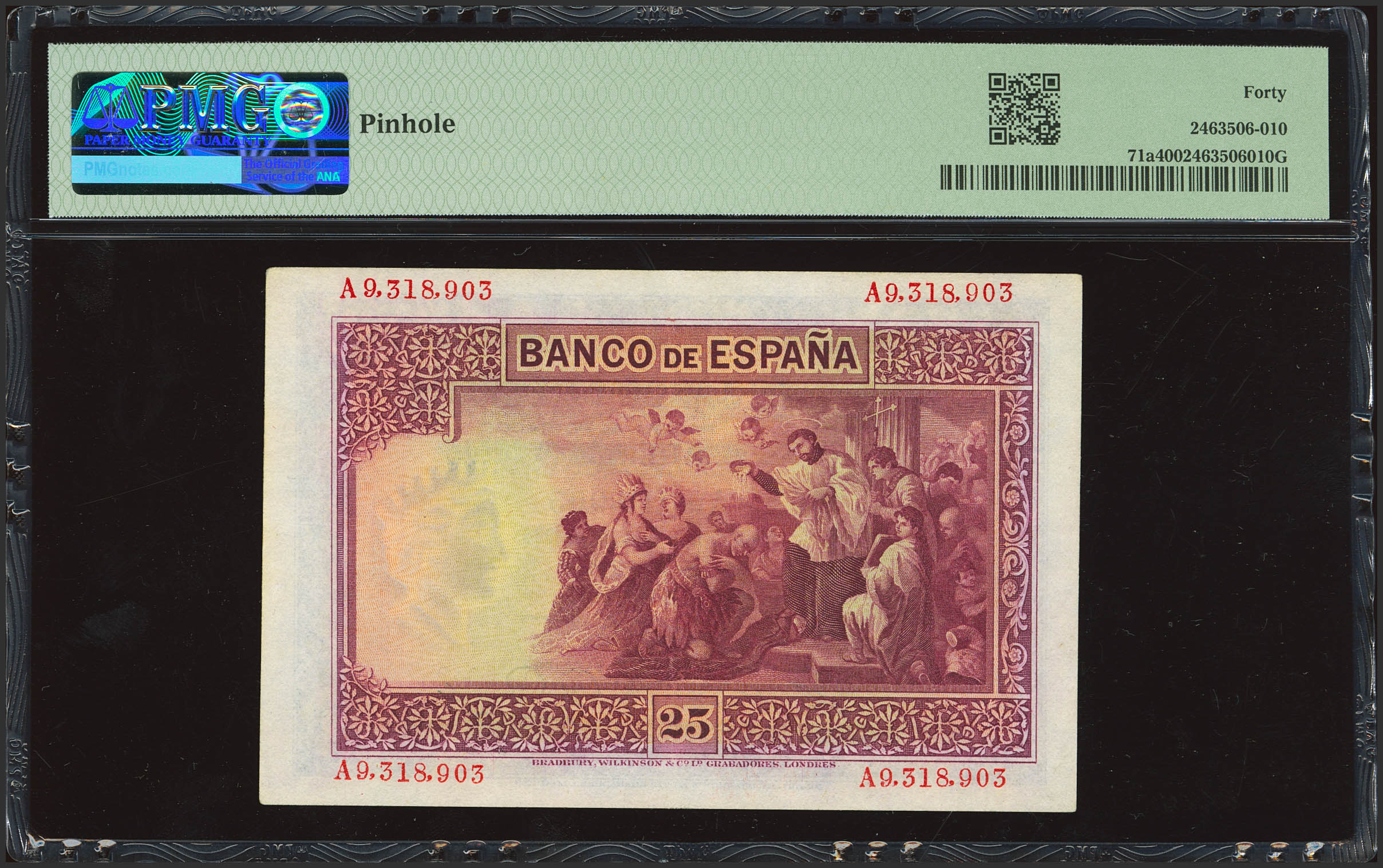 25 Pesetas. 12 de Octubre de 1926. Serie A. (Edifil 2023: 325a, Pick: 71a). EBC-. Encapsulado PMG40 (pinhole).