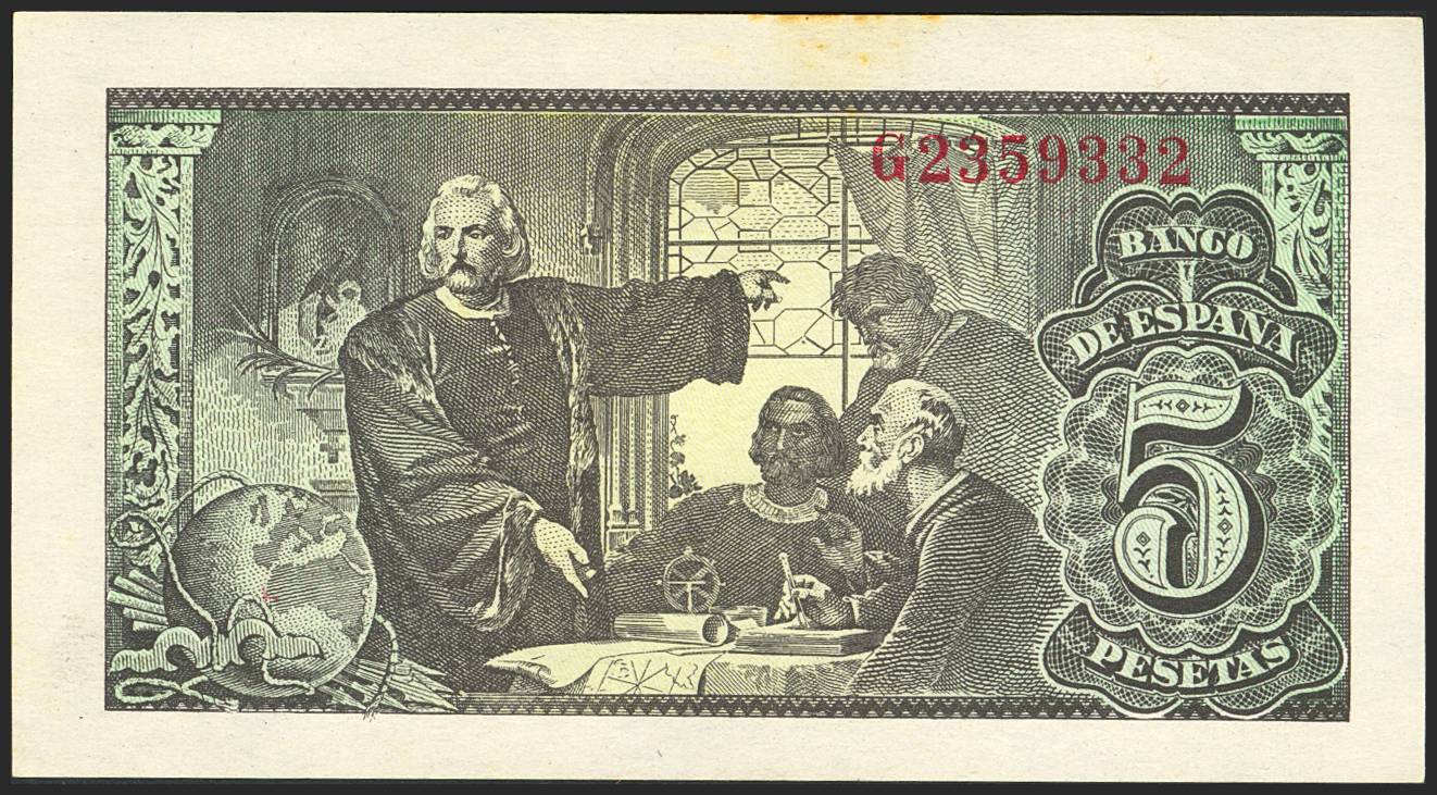 5 Pesetas. 13 de Febrero de 1943. Serie G. (Edifil 2023: 446a). Apresto original, sombritas del tiempo. EBC+.