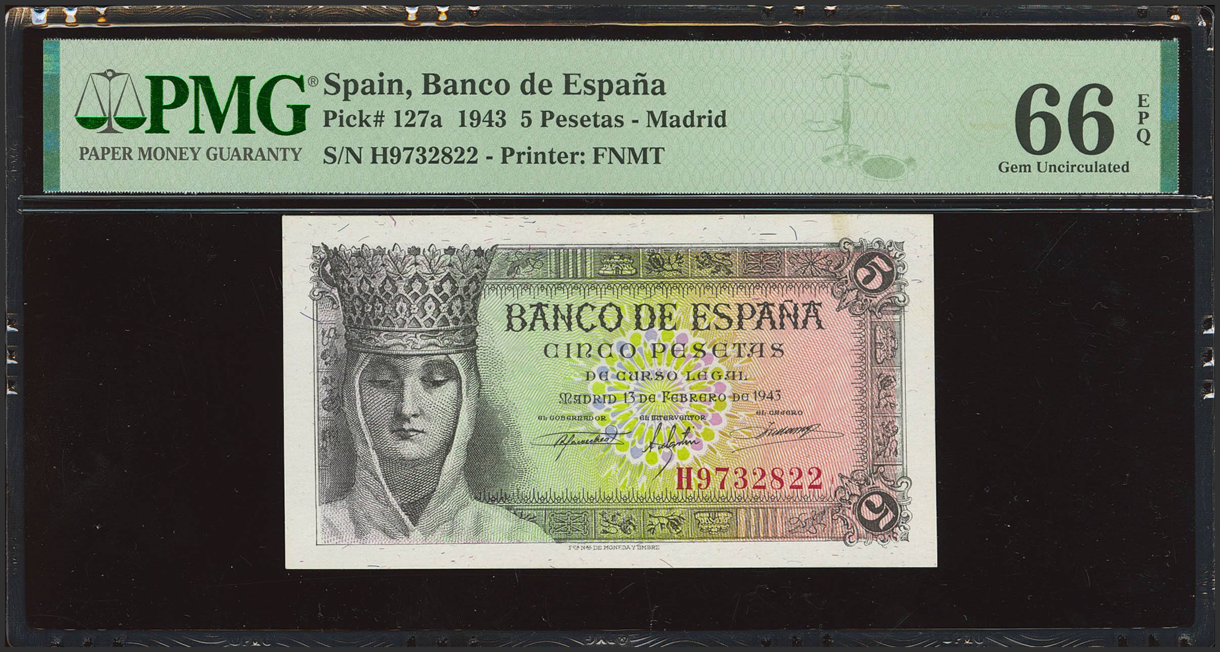 5 Pesetas. 13 de Febrero de 1943. Serie H. (Edifil 2023: 446a, Pick: 127a). Apresto original. SC. Encapsulado PMG66EPQ.