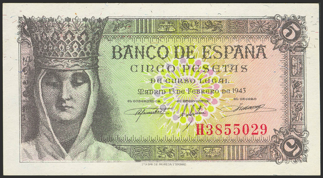 5 Pesetas. 13 de Febrero de 1943. Serie H. (Edifil 2023: 446a). Apresto original. SC-.