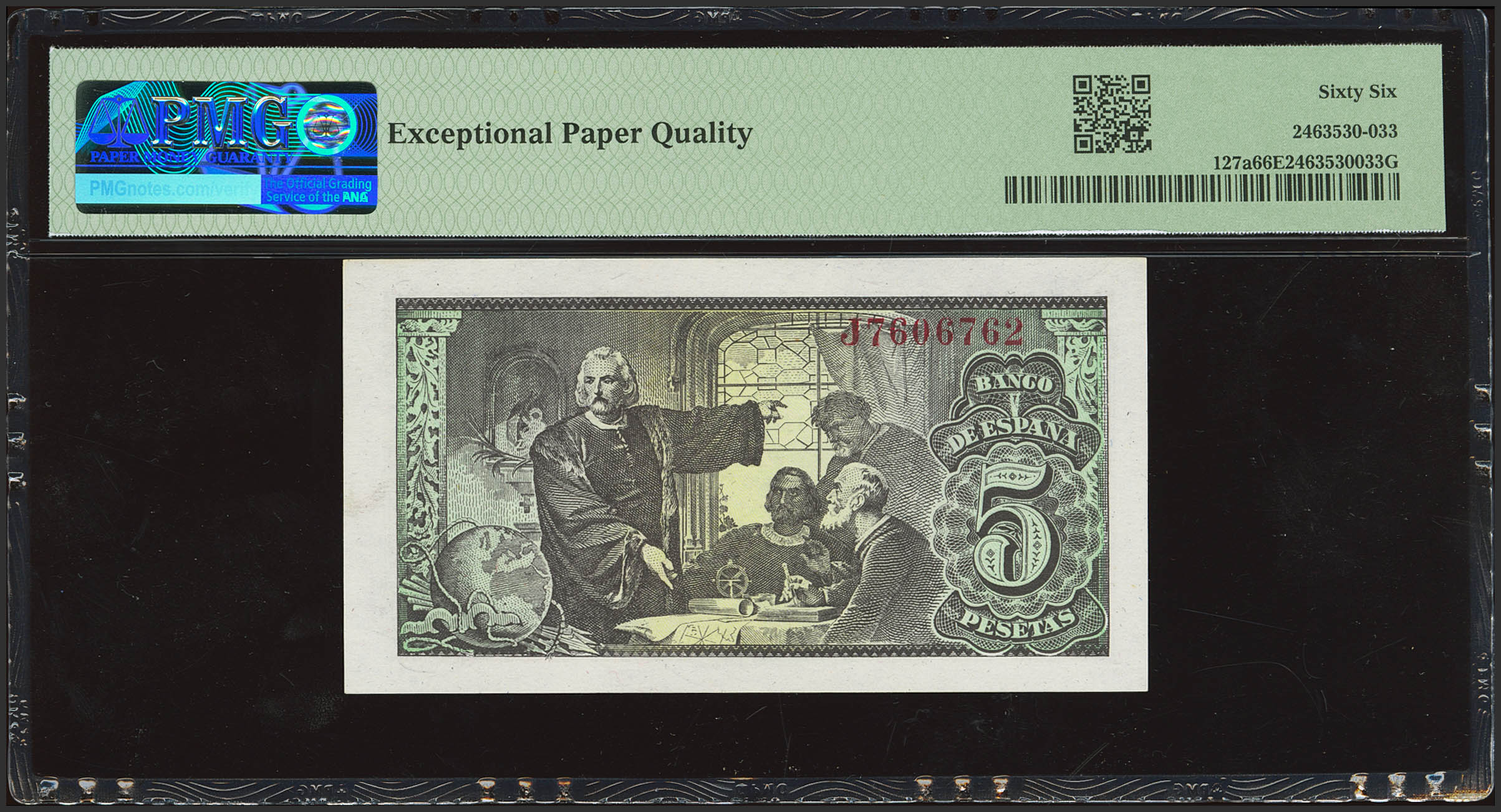 5 Pesetas. 13 de Febrero de 1943. Serie J, última serie emitida. (Edifil 2023: 446b, Pick: 127a). Apresto original. SC. Encapsulado PMG66EPQ.
