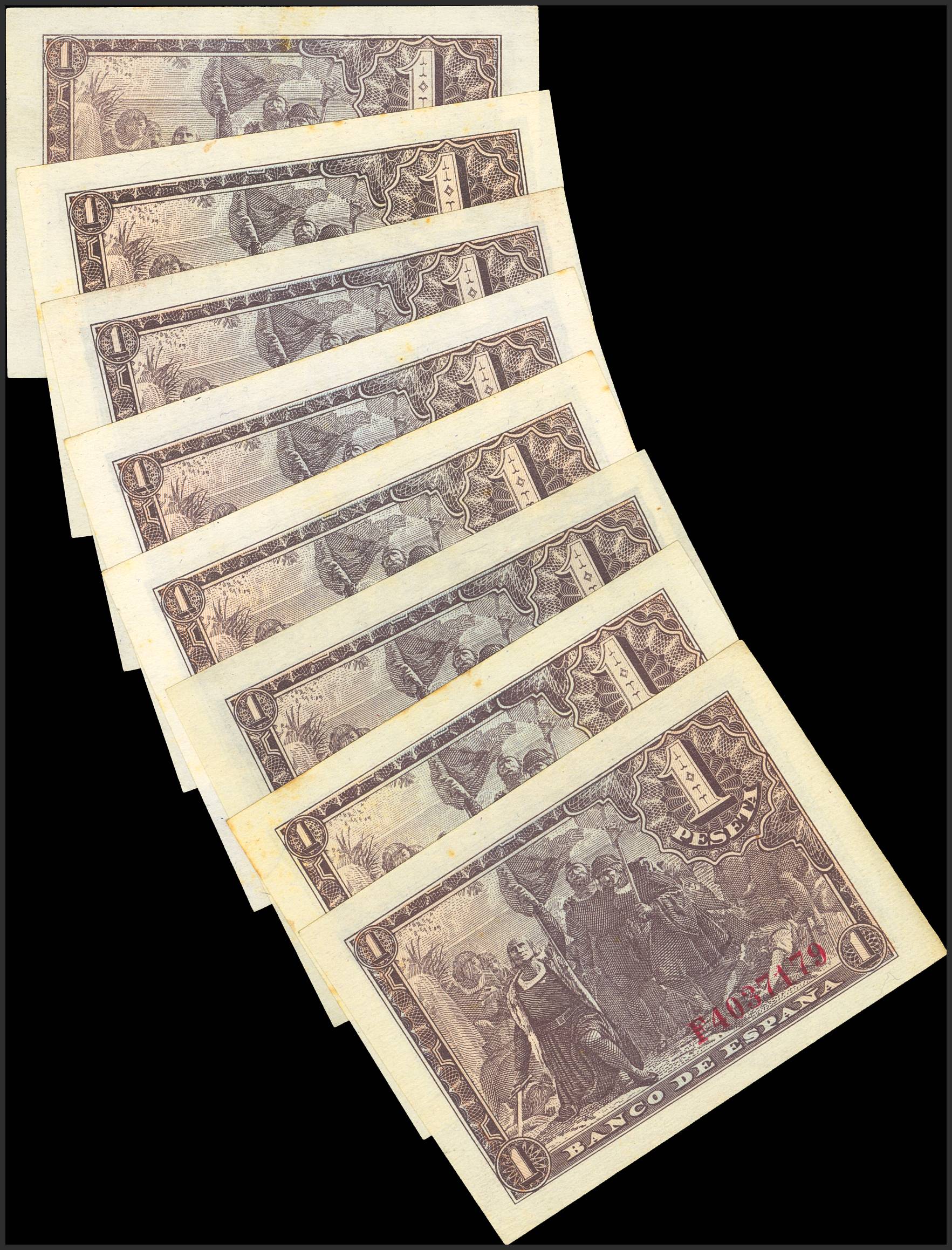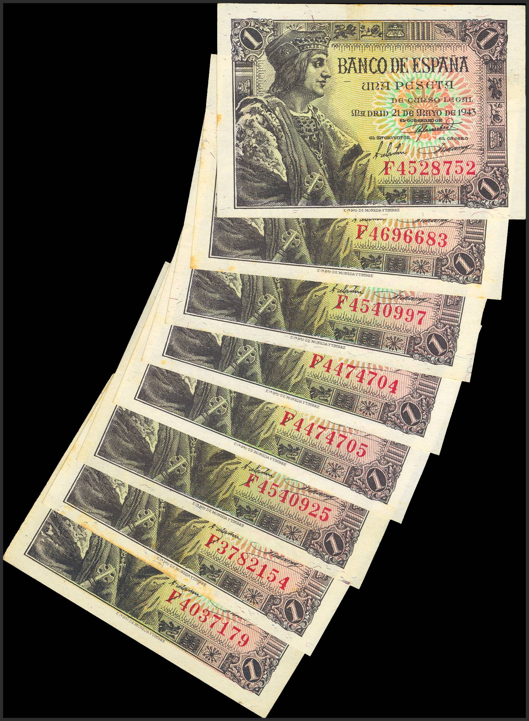 Conjunto de 8 billetes de 1 Peseta emitido el 21 de Mayo de 1943, con la serie F. (Edifil 2023: 447a). A EXAMINAR.