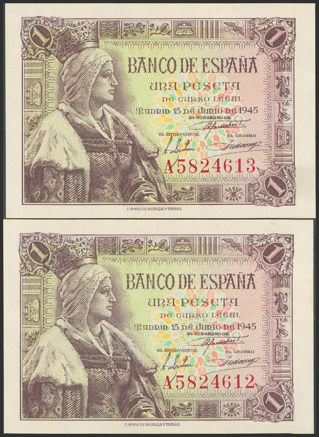 1 Peseta. 15 de Junio de 1945. Pareja correlativa. Serie A. (Edifil 2023: 448a). Apresto original. SC.