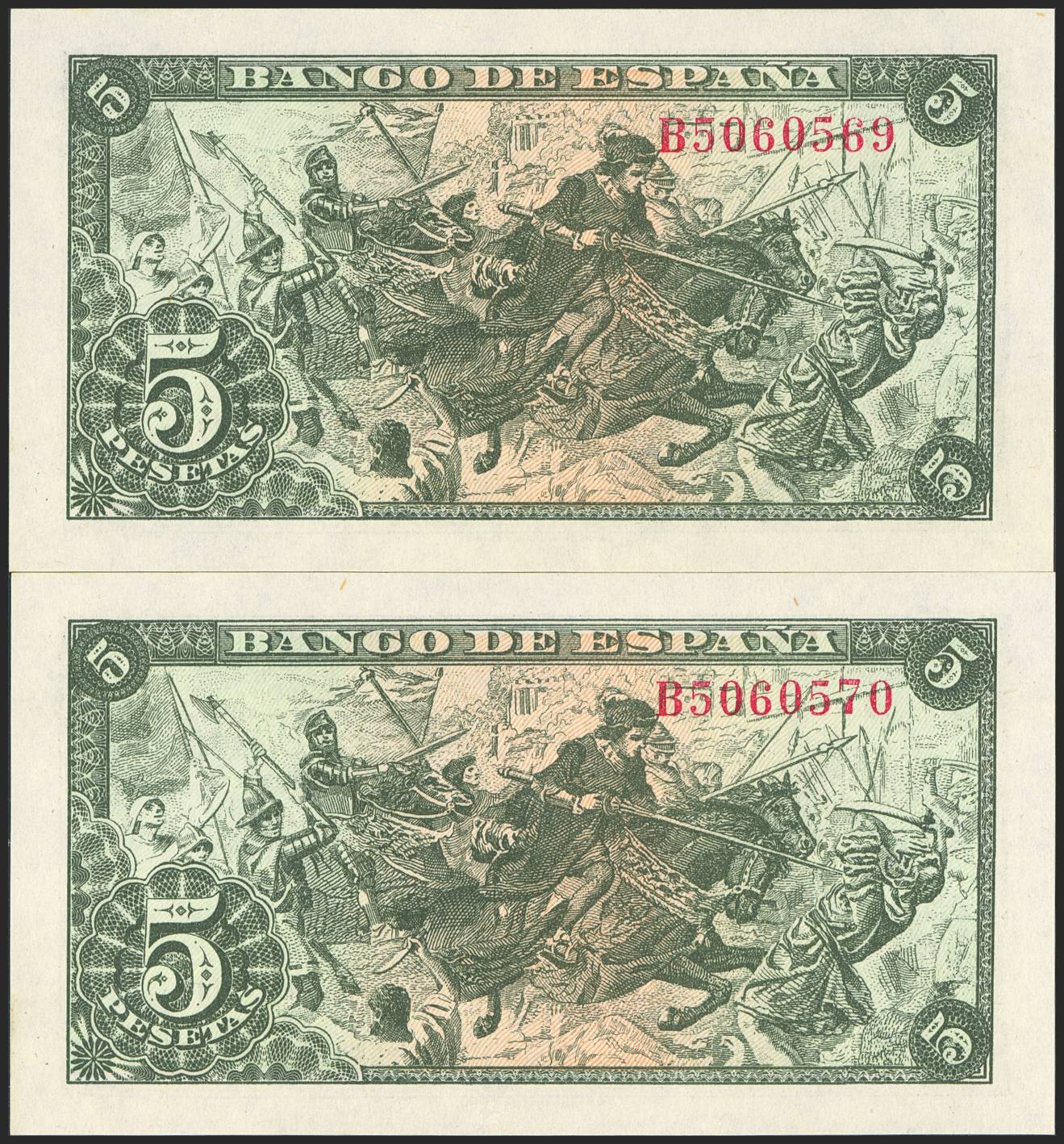 5 Pesetas. 15 de Junio de 1945. Pareja correlativa. Serie B. (Edifil 2023: 449a). Apresto original. SC.