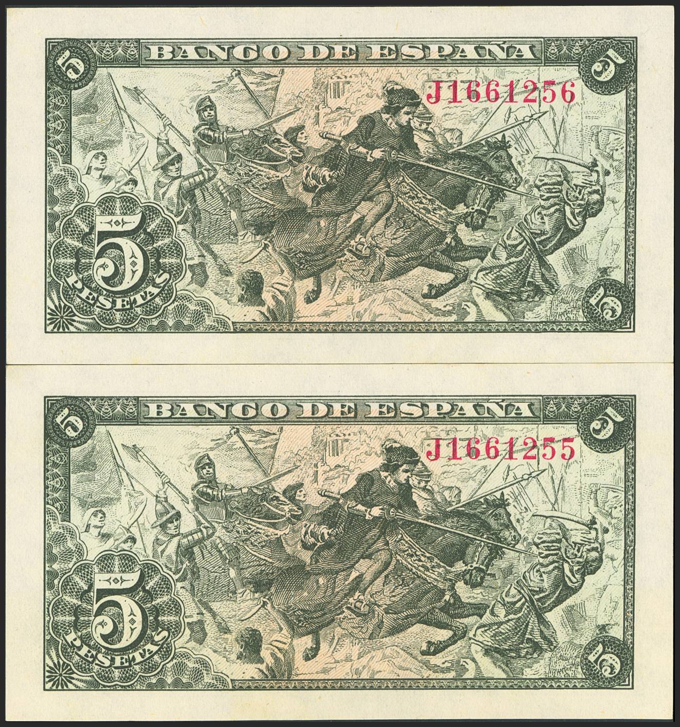 5 Pesetas. 15 de Junio de 1945. Pareja correlativa. Serie J. (Edifil 2023: 449a). Apresto original. SC.
