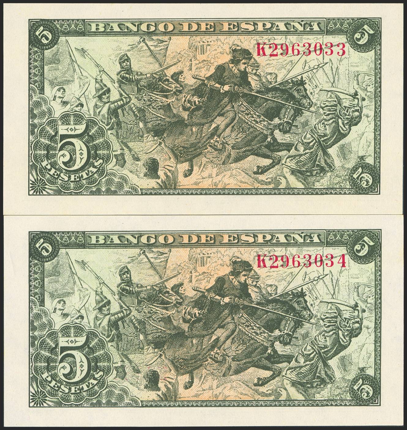 5 Pesetas. 15 de Junio de 1945. Pareja correlativa. Serie K. (Edifil 2023: 449a). Apresto original. SC/SC-.