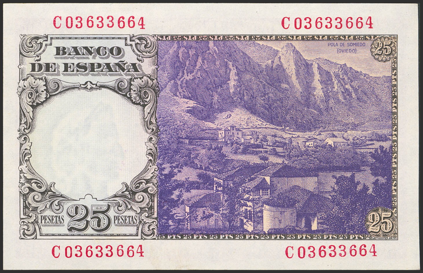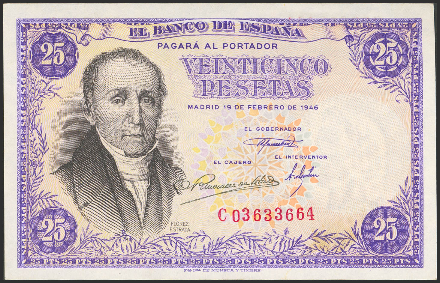 25 Pesetas. 19 de Febrero de 1946. Serie C. (Edifil 2023: 450a). Apresto original. SC.