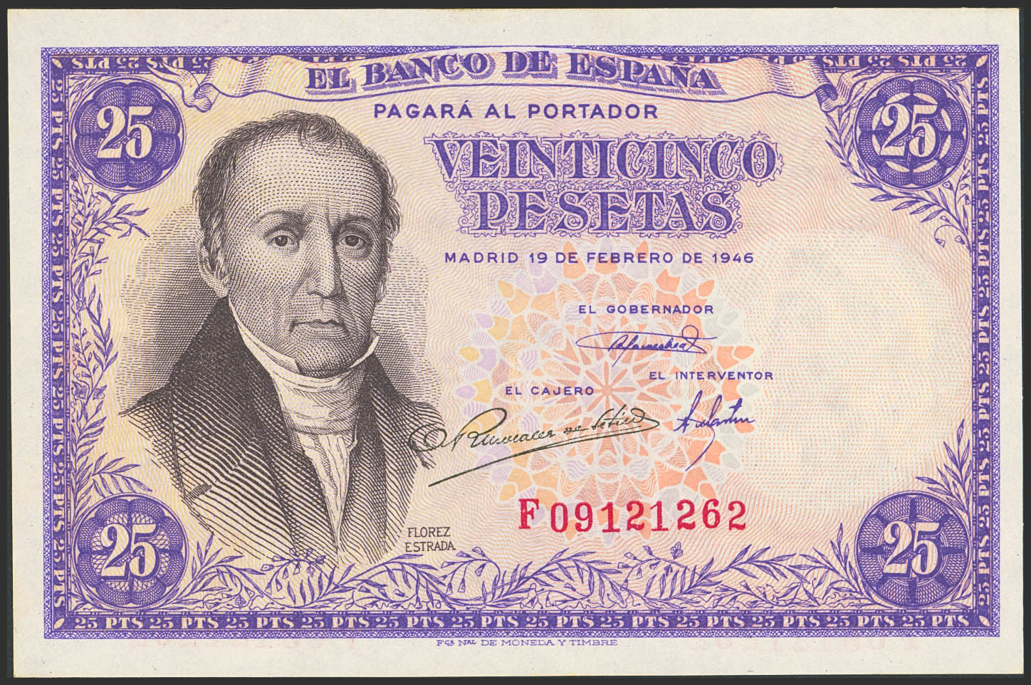 25 Pesetas. 19 de Febrero de 1946. Serie F. (Edifil 2023: 450a). Apresto original. SC-.