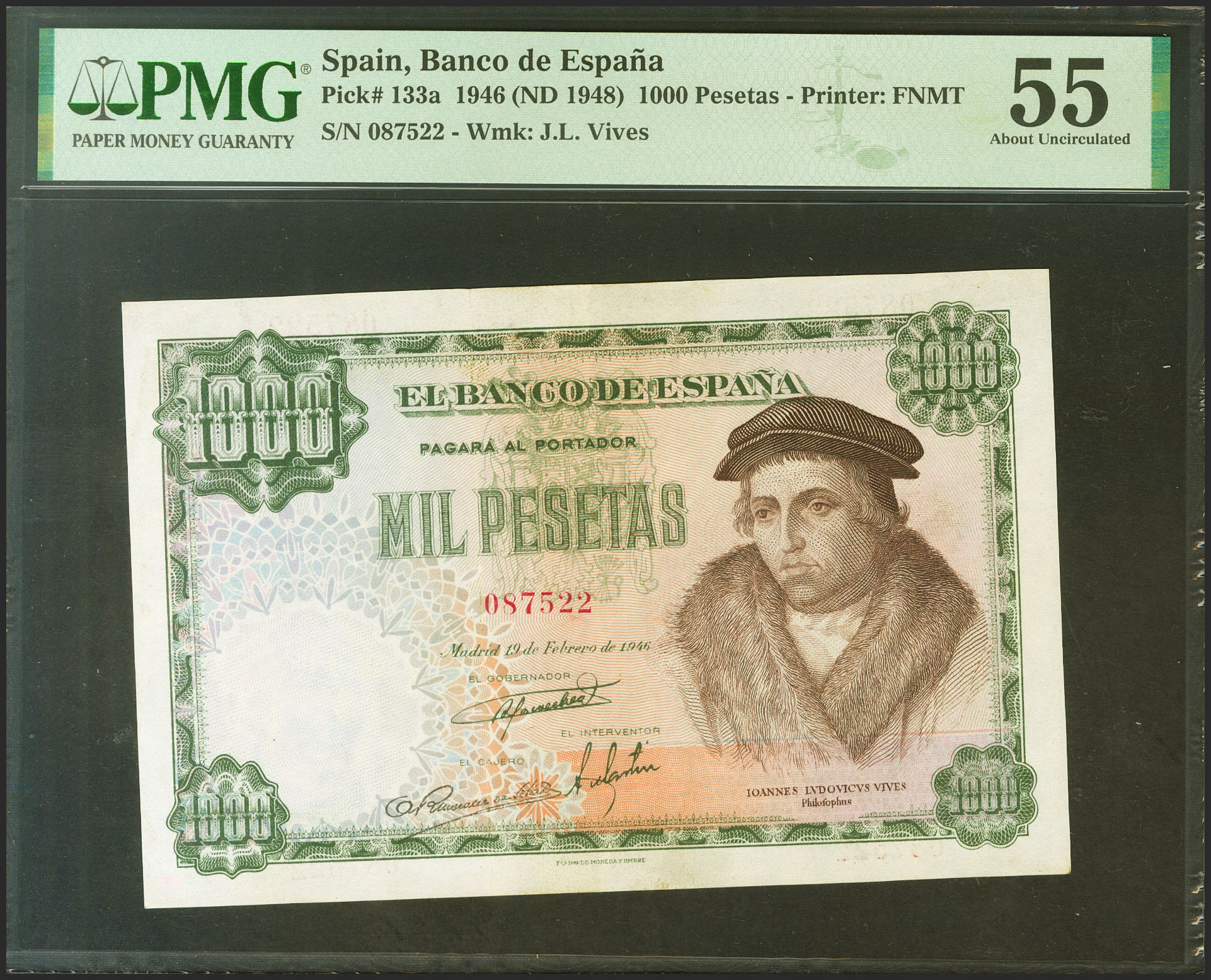 1000 Pesetas. 19 de Febrero de 1946. Sin serie. (Edifil 2021: 453, Pick: 133a). Inusual en esta calidad. EBC+. Encapsulado PMG55.