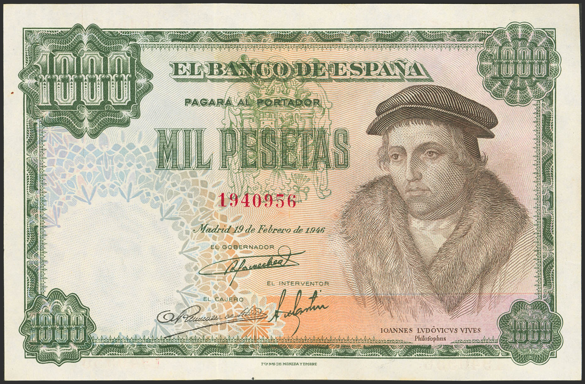 1000 Pesetas. 19 de Febrero de 1946. Sin serie. (Edifil 2023: 453). Raro en esta calidad. EBC+++.