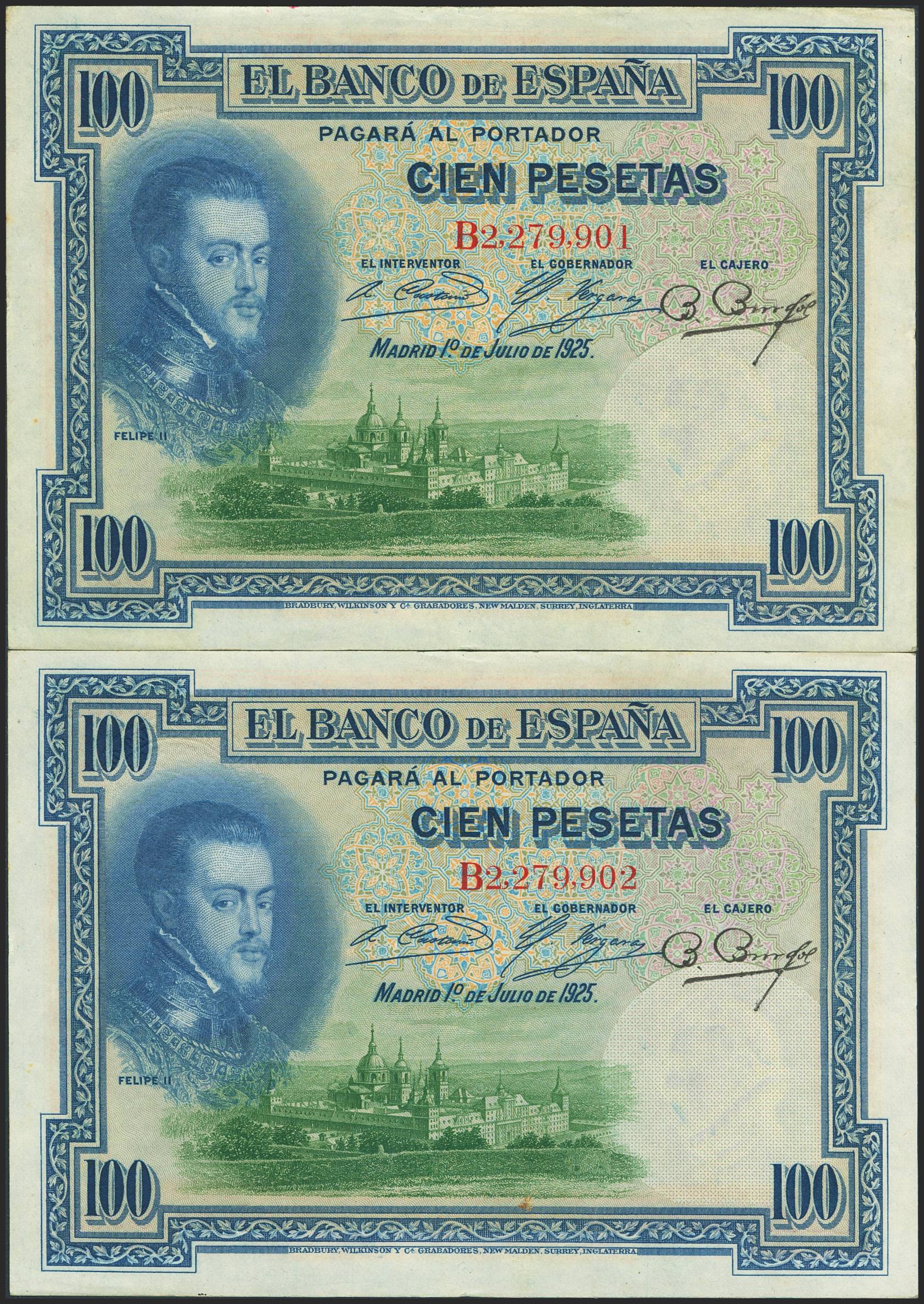 100 Pesetas. 1 de Julio de 1925. Pareja correlativa. Serie B y sello en seco GOBIERNO PROVISIONAL DE LA REPUBLICA / 14 ABRIL 1931. (Edifil 2023: 344). Conservan gran parte de su apresto original. SC--.