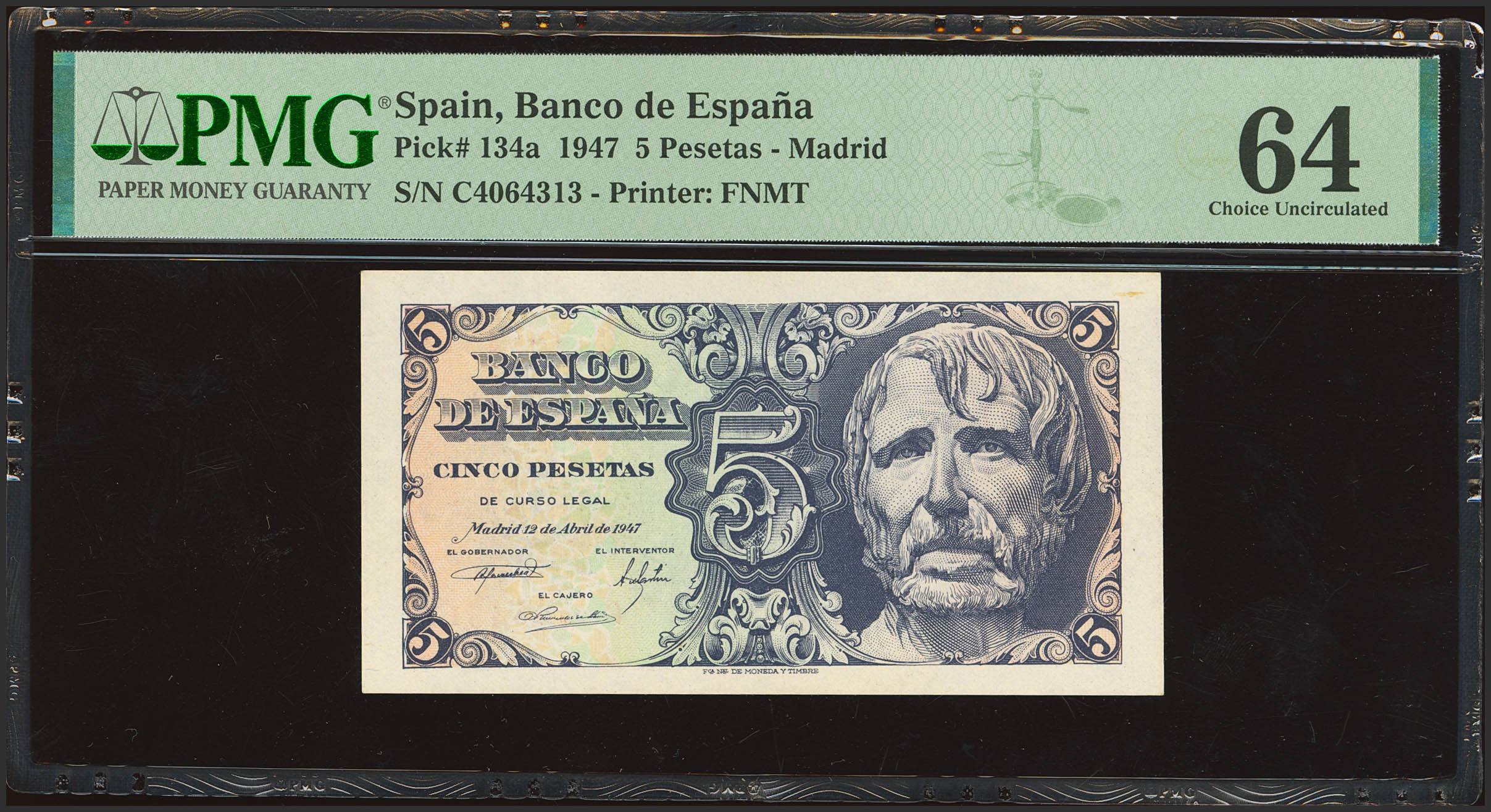 5 Pesetas. 12 de Abril de 1947. Serie C. (Edifil 2023: 454a, Pick: 134a). SC. Encapsulado PMG64.