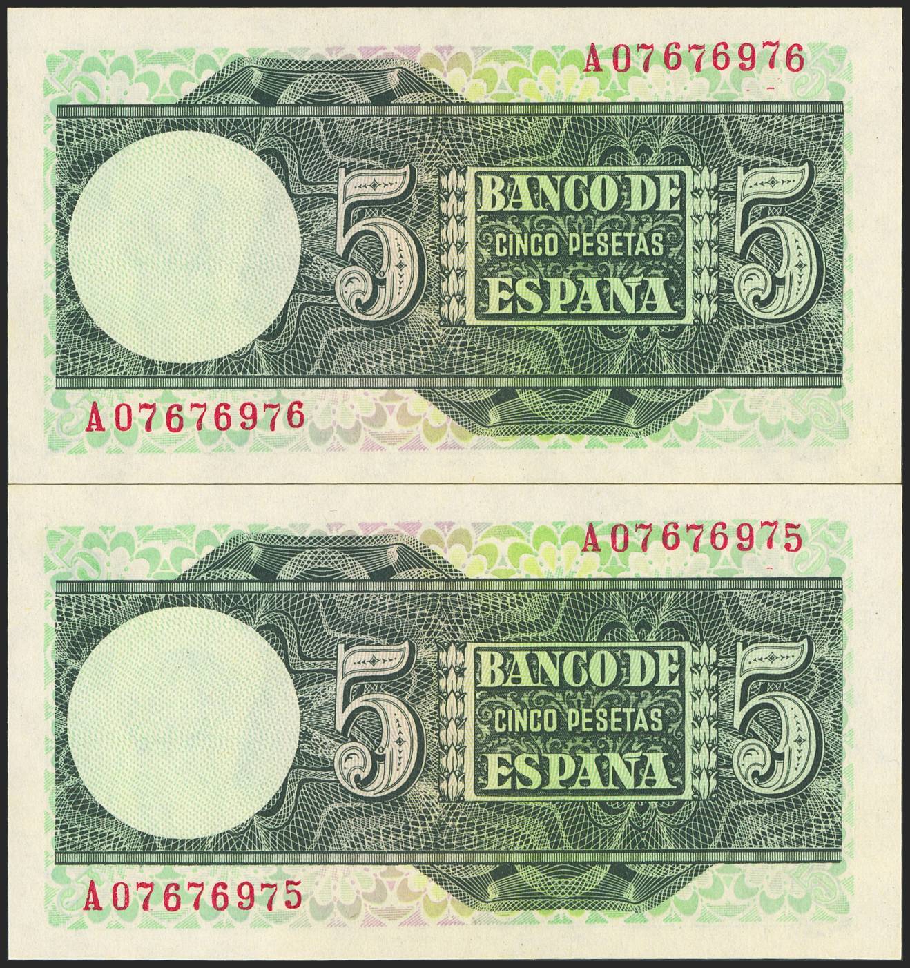 5 Pesetas. 5 de Marzo de 1948. Pareja correlativa. Serie A. (Edifil 2023: 455a). Apresto original. SC.