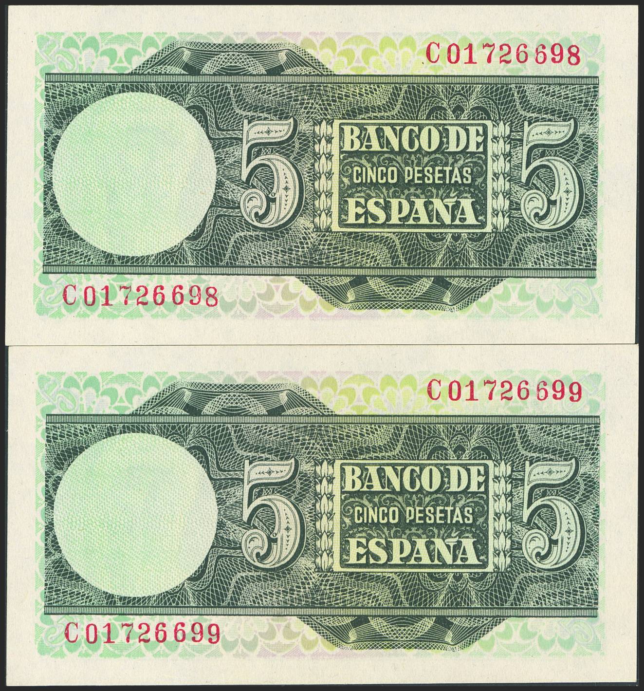 5 Pesetas. 5 de Marzo de 1948. Pareja correlativa. Serie C. (Edifil 2023: 455a). Apresto original. SC.
