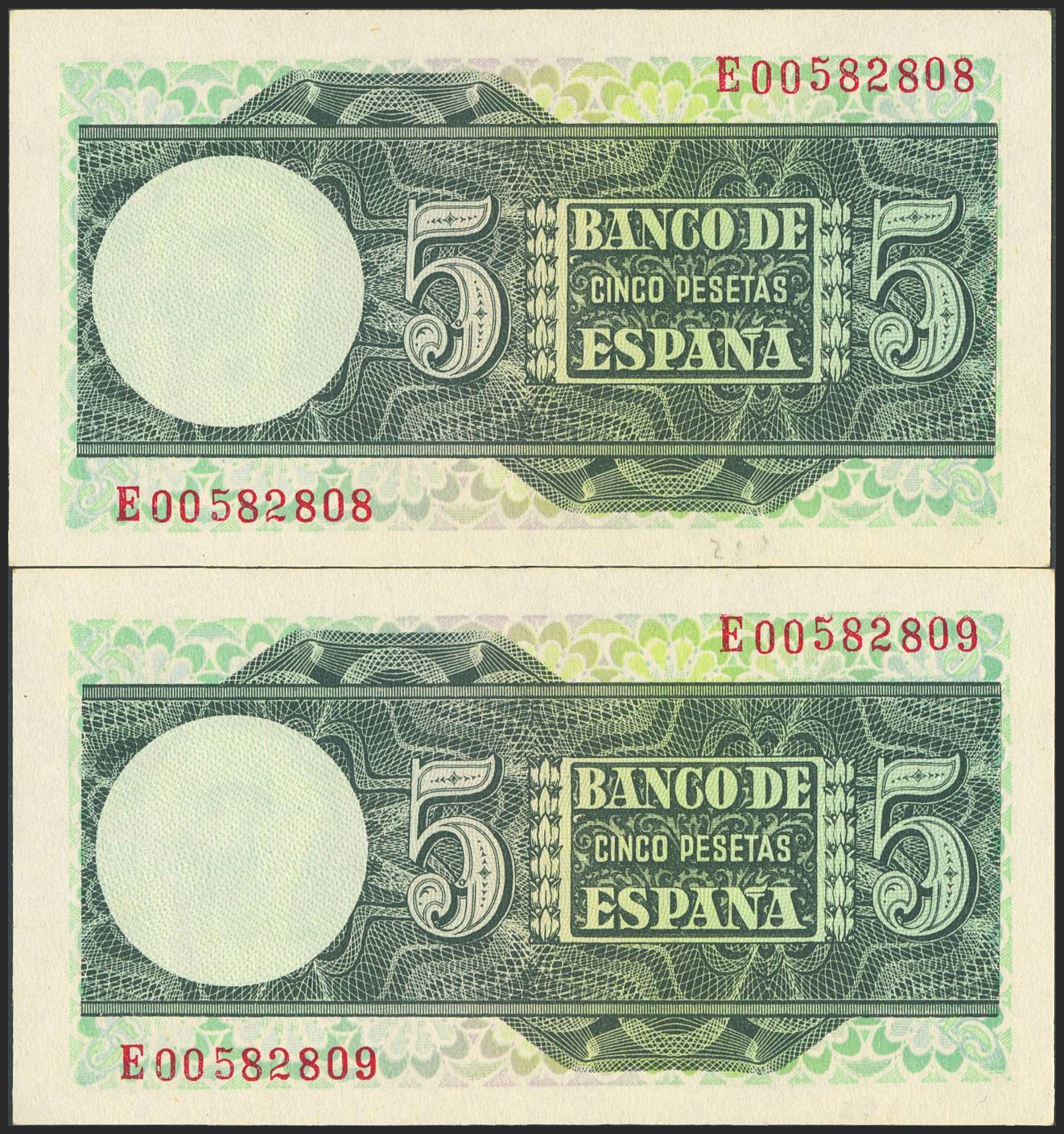 5 Pesetas. 5 de Marzo de 1948. Pareja correlativa. Serie E. (Edifil 2023: 455a). Apresto original. SC-.