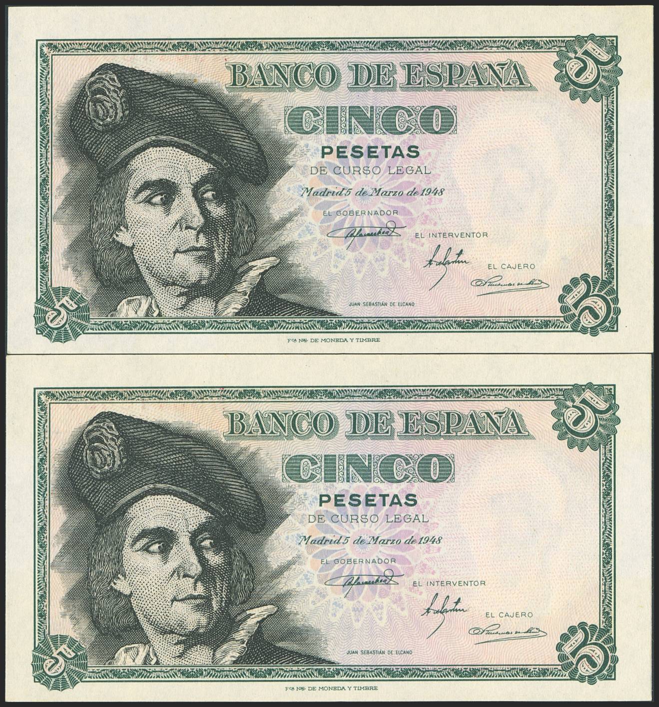 5 Pesetas. 5 de Marzo de 1948. Pareja correlativa. Serie H. (Edifil 2023: 455a). Apresto original. SC/SC-.